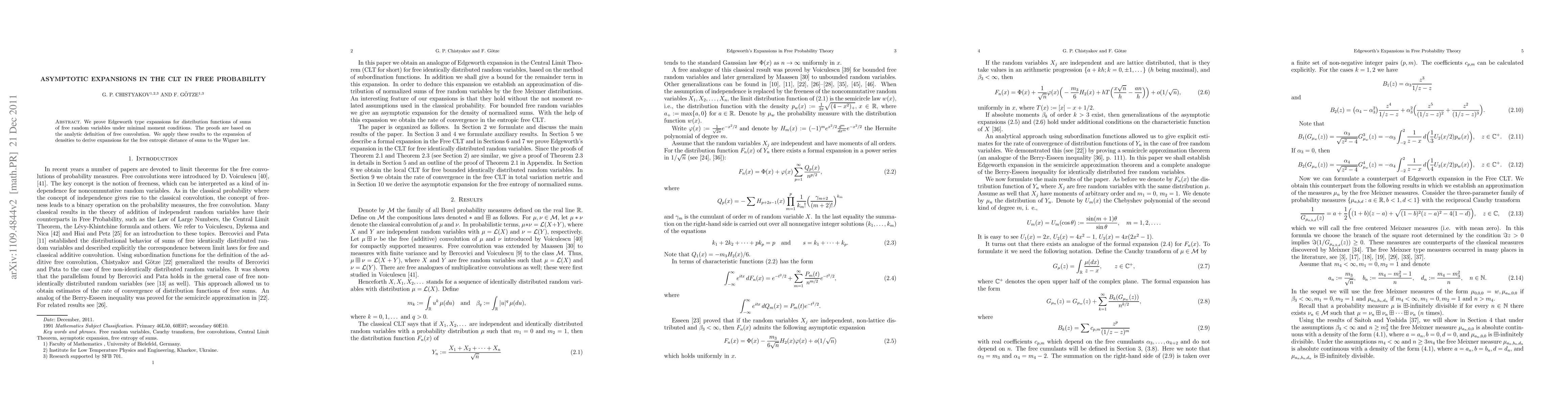 This paper proves Edgeworth expansions for sums of free random variables under minimal moment conditions using the analytic definition of free convolution, and applies these expansions to derive results for the free entropic distance to the Wigner law.