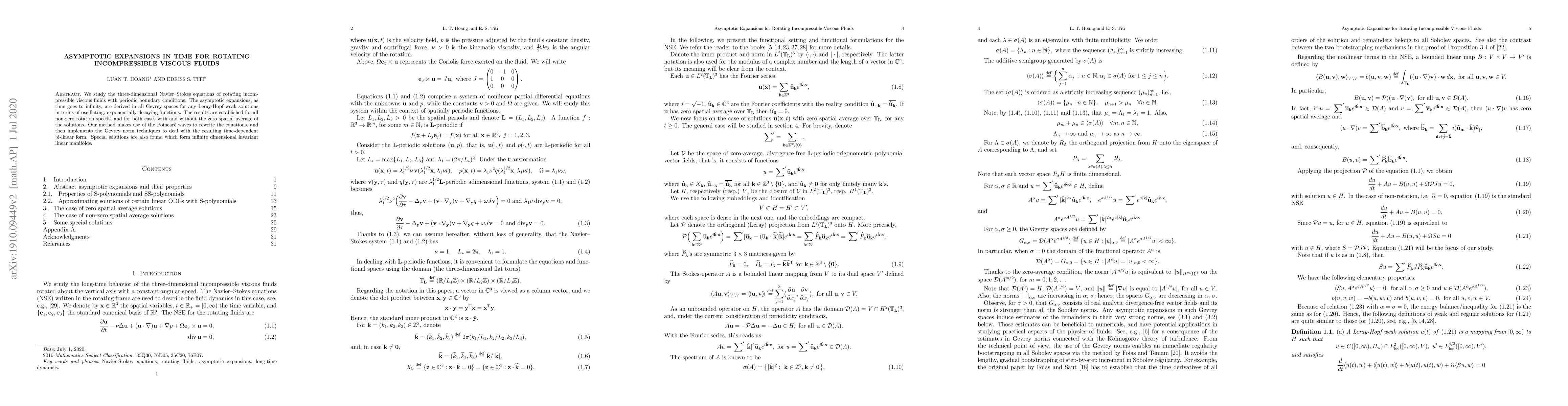 This paper derives asymptotic expansions for the three-dimensional Navier-Stokes equations governing rotating incompressible viscous fluids, focusing on the behavior of solutions as time approaches infinity. The method utilizes Poincaré waves and Gevrey norm techniques to establish results in all Gevrey spaces, applicable to any Leray-Hopf weak solutions, including those with non-zero rotation speeds and varying spatial averages.