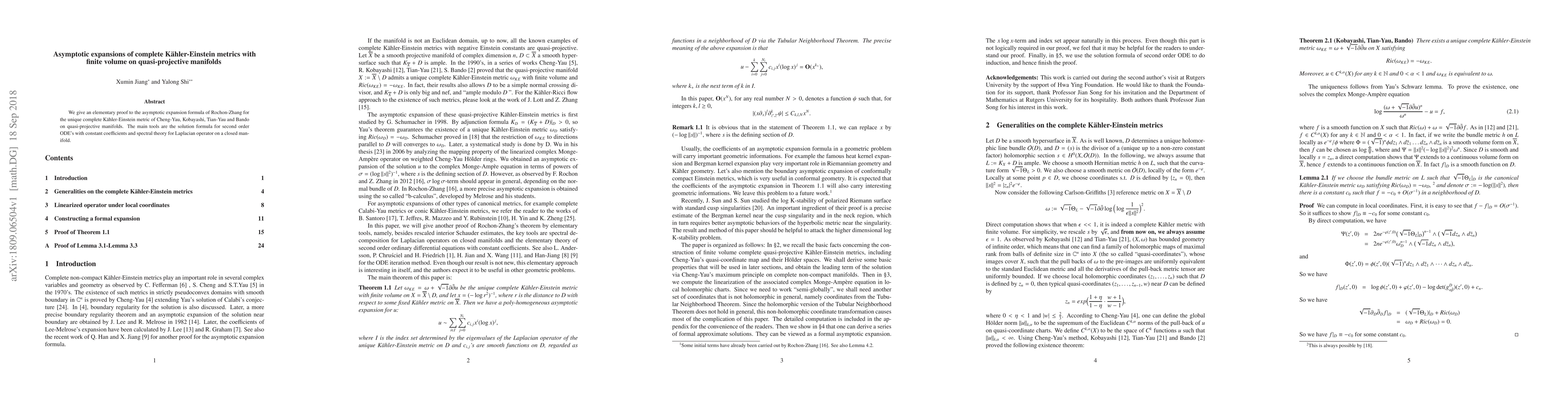 This paper provides an elementary proof for the asymptotic expansion formula of the unique complete Kähler-Einstein metric on quasi-projective manifolds, utilizing solutions to second-order ODEs and spectral theory for the Laplacian operator.