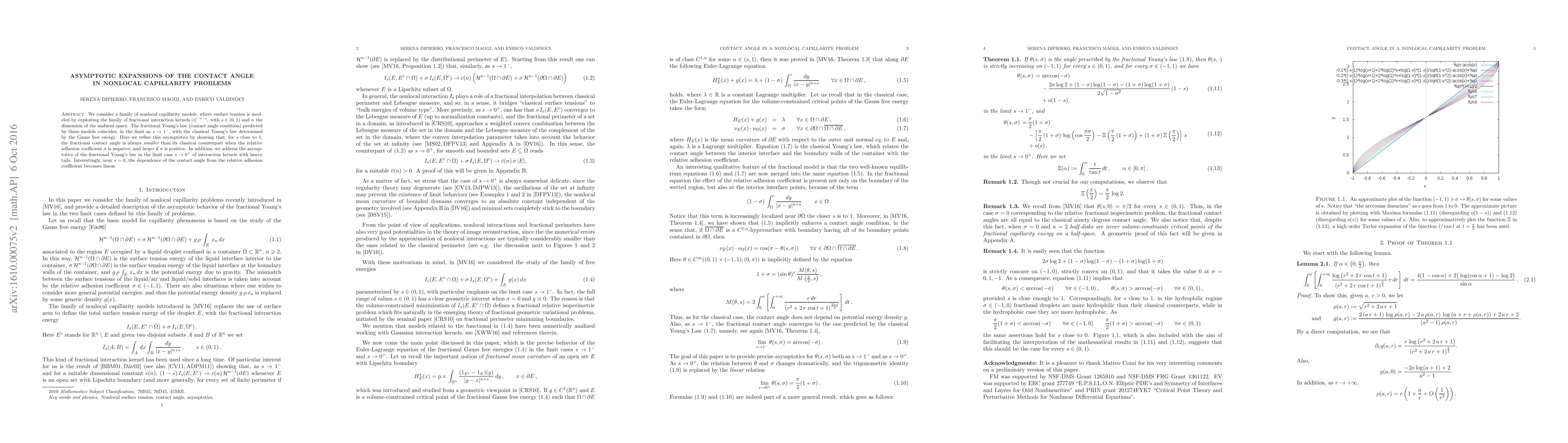 This paper investigates nonlocal capillarity models using fractional interaction kernels, showing that the fractional contact angle differs from the classical one based on the relative adhesion coefficient. It finds that the fractional contact angle is smaller when the adhesion coefficient is negative and larger when it is positive, as $s$ approaches 1.