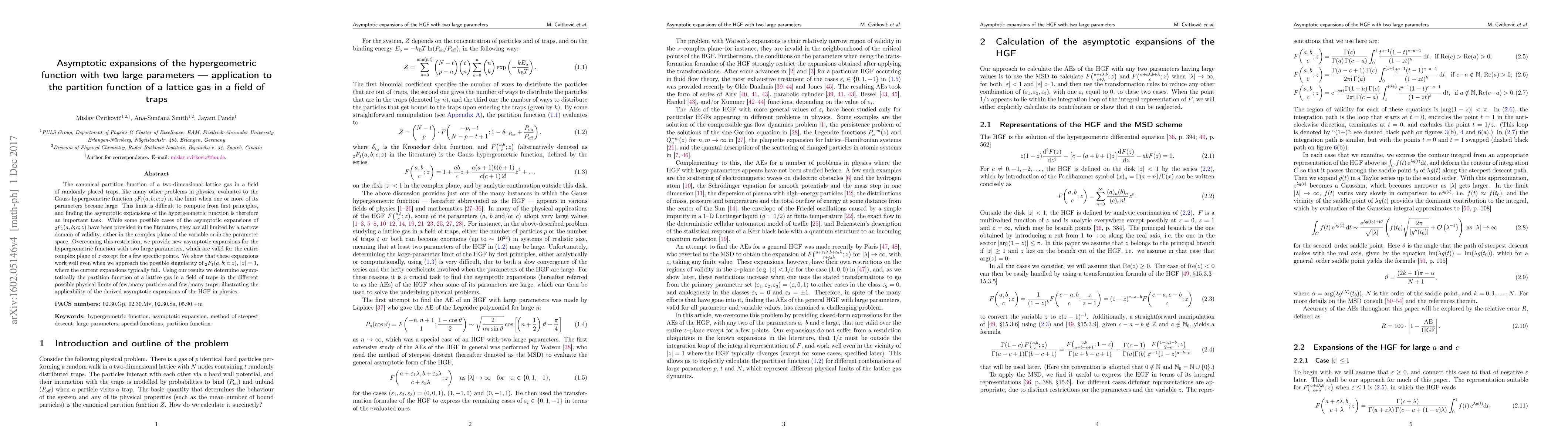 Researchers developed new asymptotic expansions for the hypergeometric function with two large parameters, providing a solution to compute its value in the entire complex plane except for specific points, and applied it to calculate the partition function of a lattice gas in a field of traps.