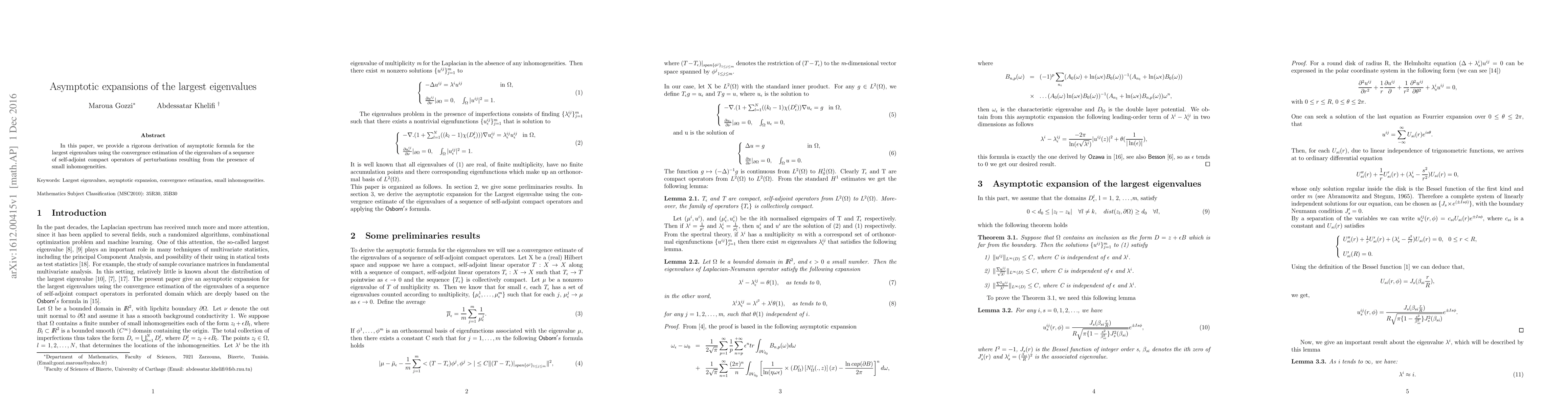 In this paper, we provide a rigorous derivation of asymptotic formula for the largest eigenvalues using the convergence estimation of the eigenvalues of a sequence of self-adjoint compact operators of perturbations resulting from the presence of small inhomogeneities.