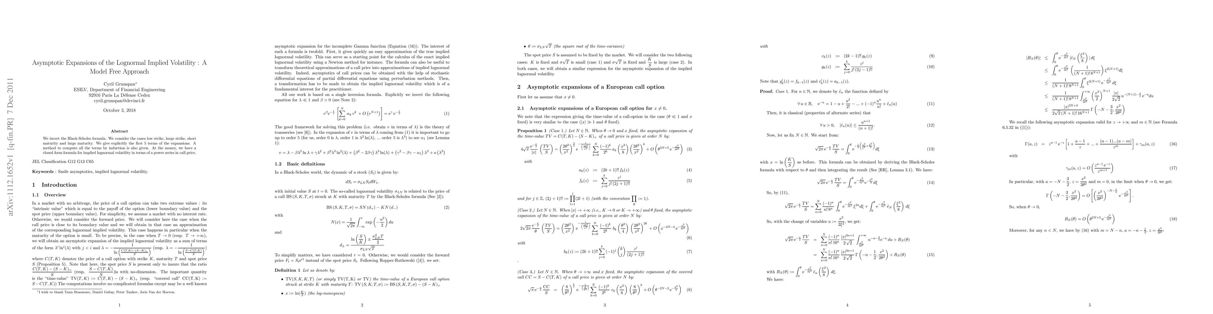 We invert the Black-Scholes formula. We consider the cases low strike, large strike, short maturity and large maturity. We give explicitly the first 5 terms of the expansions. A method to compute all the terms by induction is also given. At the money, we have a closed form formula for implied lognormal volatility in terms of a power series in call price.