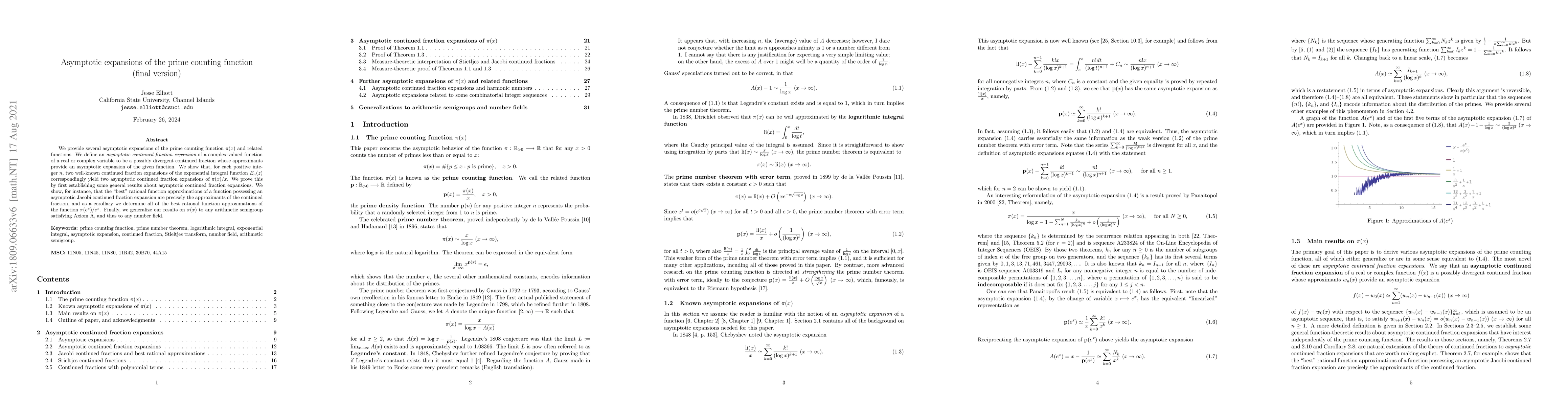 We provide several asymptotic expansions of the prime counting function $\pi(x)$ and related functions. We define an {\it asymptotic continued fraction expansion} of a complex-valued function of a real or complex variable to be a possibly divergent continued fraction whose approximants provide an asymptotic expansion of the given function. We show that, for each positive integer $n$, two well-known continued fraction expansions of the exponential integral function $E_n(z)$ correspondingly yield two asymptotic continued fraction expansions of $\pi(x)/x$. We prove this by first establishing some general results about asymptotic continued fraction expansions. We show, for instance, that the "best"' rational function approximations of a function possessing an asymptotic Jacobi continued fraction expansion are precisely the approximants of the continued fraction, and as a corollary we determine all of the best rational function approximations of the function $\pi(e^x)/e^x$. Finally, we generalize our results on $\pi(x)$ to any arithmetic semigroup satisfying Axiom A, and thus to any number field.
