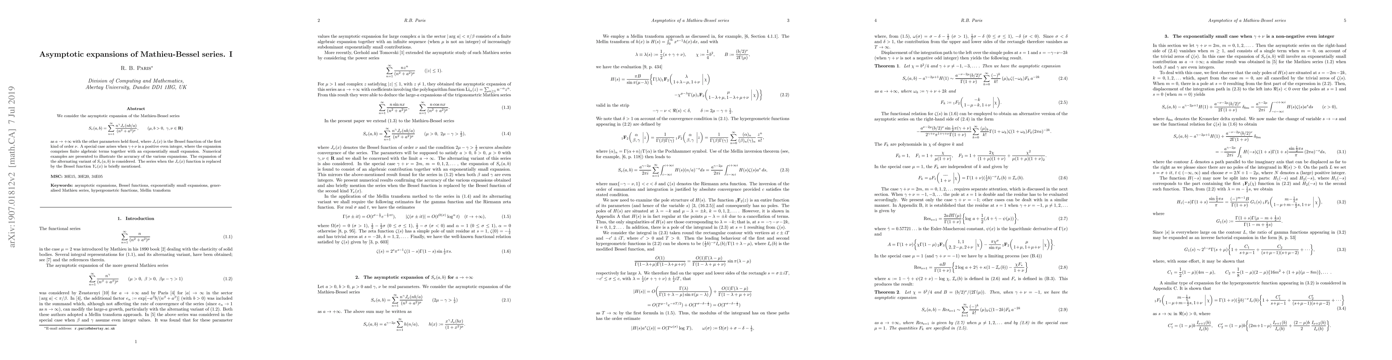 This paper investigates the asymptotic expansion of the Mathieu-Bessel series as \(a\) approaches infinity, revealing a special case where the expansion includes finite algebraic terms and an exponentially small component. Numerical examples demonstrate the accuracy of the derived expansions.
