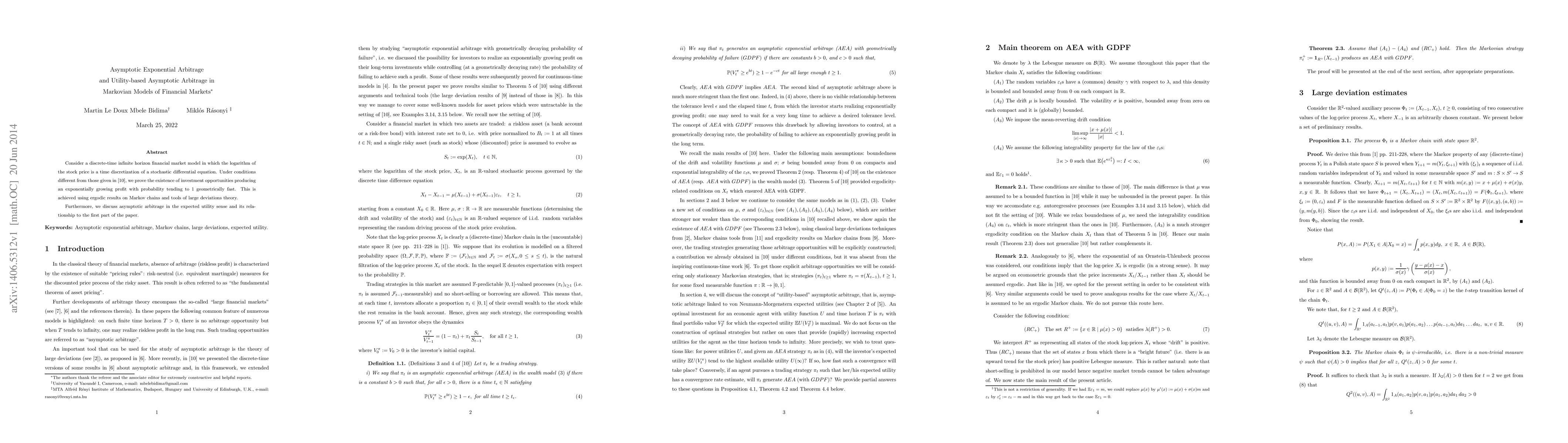 This paper explores the existence of exponential arbitrage opportunities in a discrete-time financial market model, proving their presence under new conditions using Markov chain ergodicity and large deviations theory. It also discusses utility-based asymptotic arbitrage and its connection to the identified exponential profit opportunities.