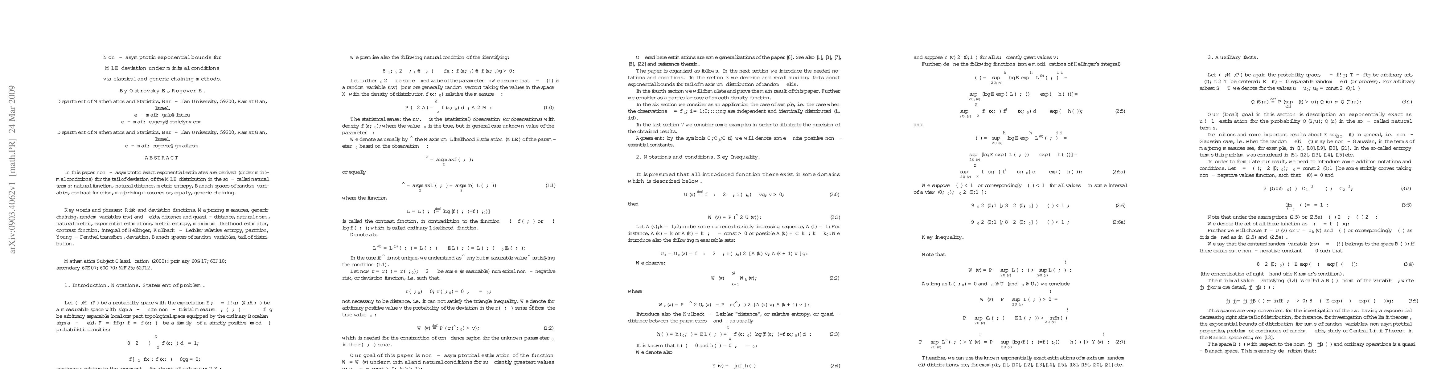 This paper provides non-asymptotic exact exponential bounds for the deviation of Maximum Likelihood Estimators under minimal conditions, utilizing classical and generic chaining methods to achieve these estimates. The results are expressed in terms of natural function, distance, metric entropy, and Banach spaces of random variables.
