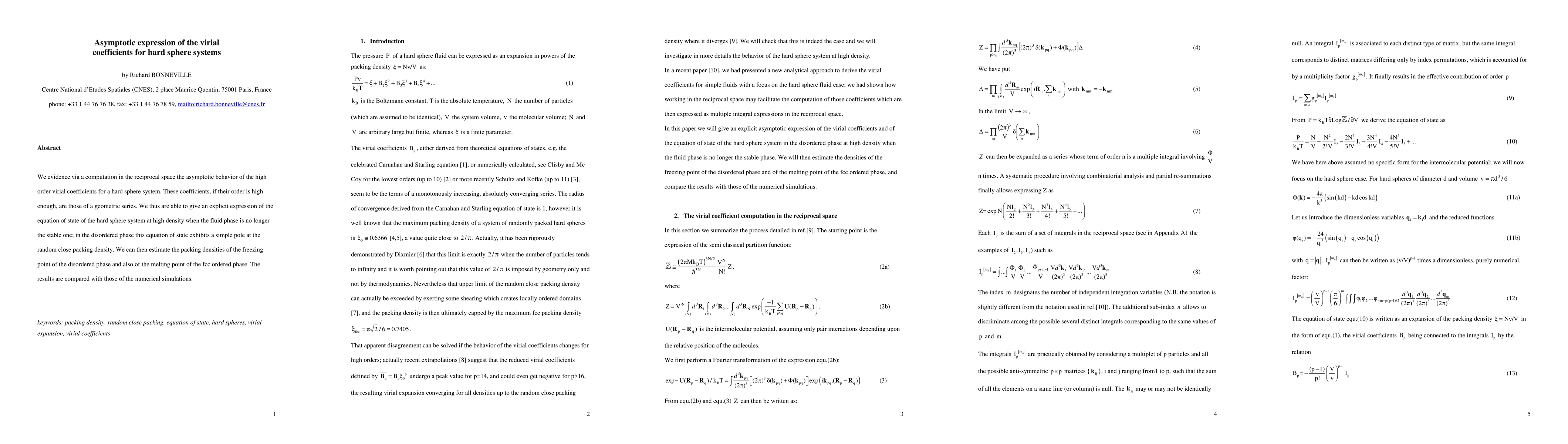 This paper derives an asymptotic expression for the high-order virial coefficients of hard sphere systems in reciprocal space, revealing a geometric series behavior. The study provides an explicit equation of state for the disordered phase at high densities, showing a simple pole at the random close packing density, and estimates the packing densities for the freezing and melting points, which are compared with numerical simulations.