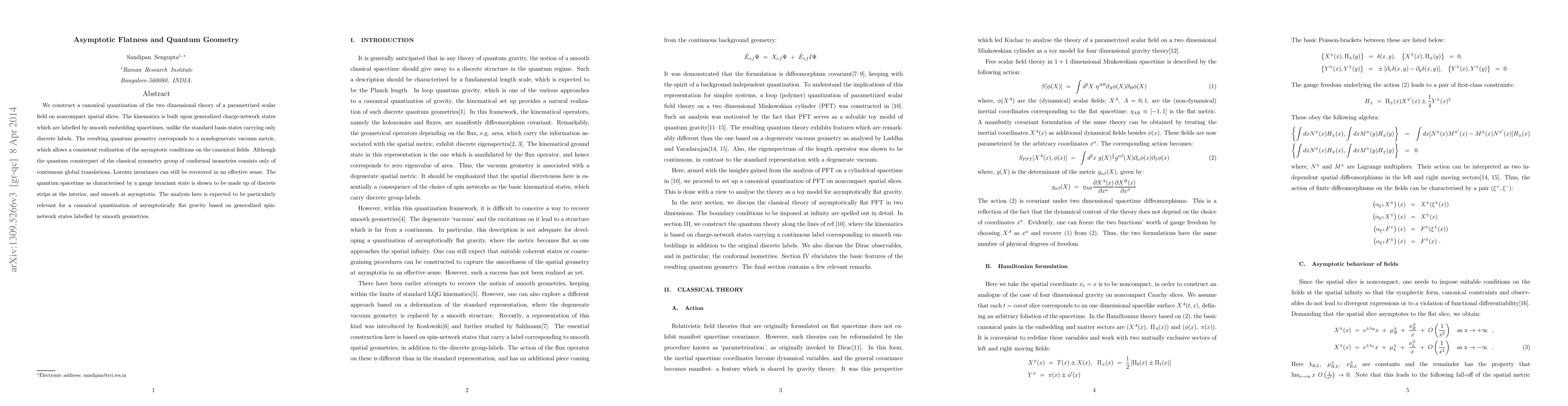 We construct a canonical quantization of the two dimensional theory of a parametrized scalar field on noncompact spatial slices. The kinematics is built upon generalized charge-network states which are labelled by smooth embedding spacetimes, unlike the standard basis states carrying only discrete labels. The resulting quantum geometry corresponds to a nondegenerate vacuum metric, which allows a consistent realization of the asymptotic conditions on the canonical fields. Although the quantum counterpart of the classical symmetry group of conformal isometries consists only of continuous global translations, Lorentz invariance can still be recovered in an effective sense. The quantum spacetime as characterized by a gauge invariant state is shown to be made up of discrete strips at the interior, and smooth at asymptotia. The analysis here is expected to be particularly relevant for a canonical quantization of asymptotically flat gravity based on generalized spin-network states labelled by smooth geometries.