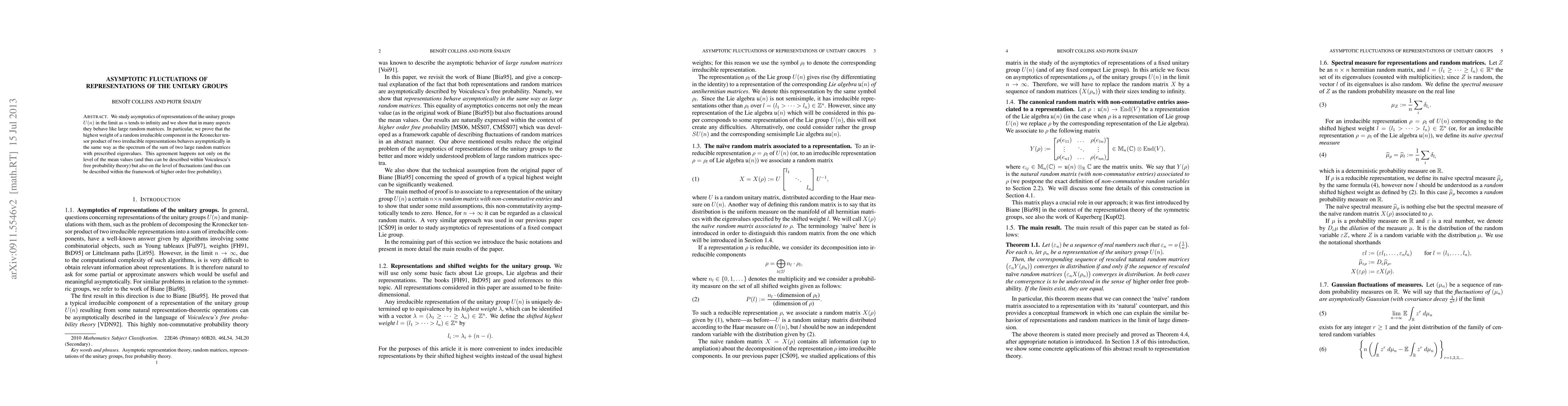 We study asymptotics of representations of the unitary groups U(n) in the limit as n tends to infinity and we show that in many aspects they behave like large random matrices. In particular, we prove that the highest weight of a random irreducible component in the Kronecker tensor product of two irreducible representations behaves asymptotically in the same way as the spectrum of the sum of two large random matrices with prescribed eigenvalues. This agreement happens not only on the level of the mean values (and thus can be described within Voiculescu's free probability theory) but also on the level of fluctuations (and thus can be described within the framework of higher order free probability).