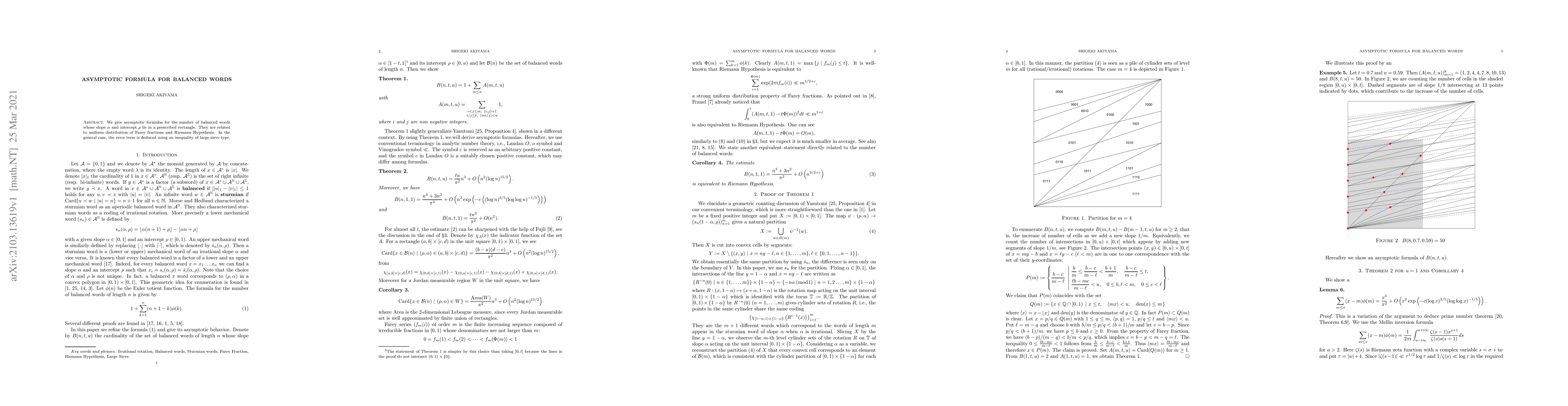 We give asymptotic formulas for the number of balanced words whose slope $\alpha$ and intercept $\rho$ lie in a prescribed rectangle. They are related to uniform distribution of Farey fractions and Riemann Hypothesis. In the general case, the error term is deduced using an inequality of large sieve type.