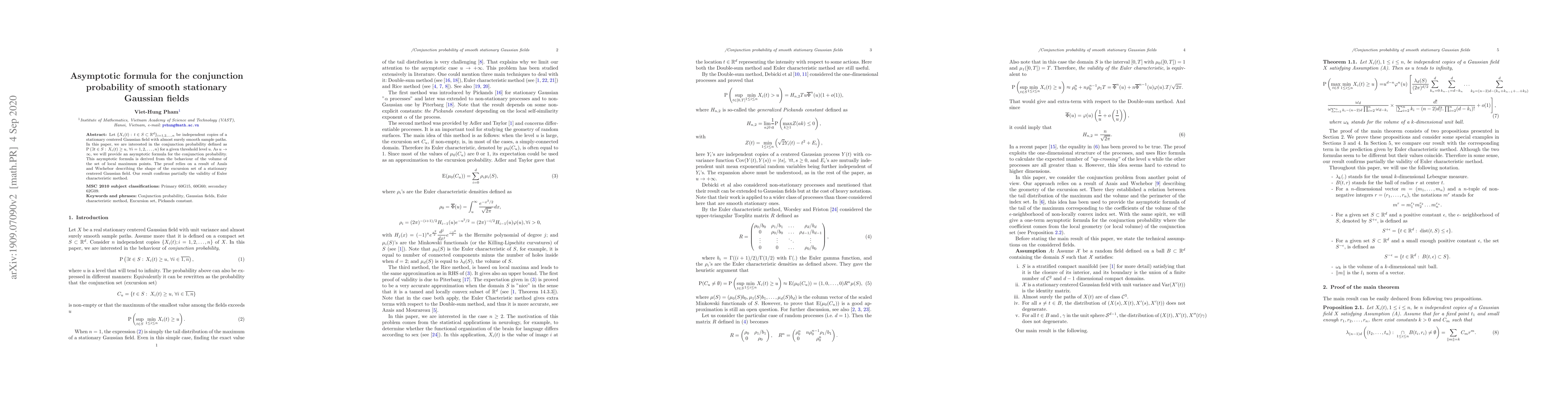 This paper derives an asymptotic formula for the conjunction probability of smooth stationary Gaussian fields as the threshold increases, based on the volume of local maximum points and using results from Azáis and Wschebor on Gaussian field excursion sets. The findings partially validate the Euler characteristic method.
