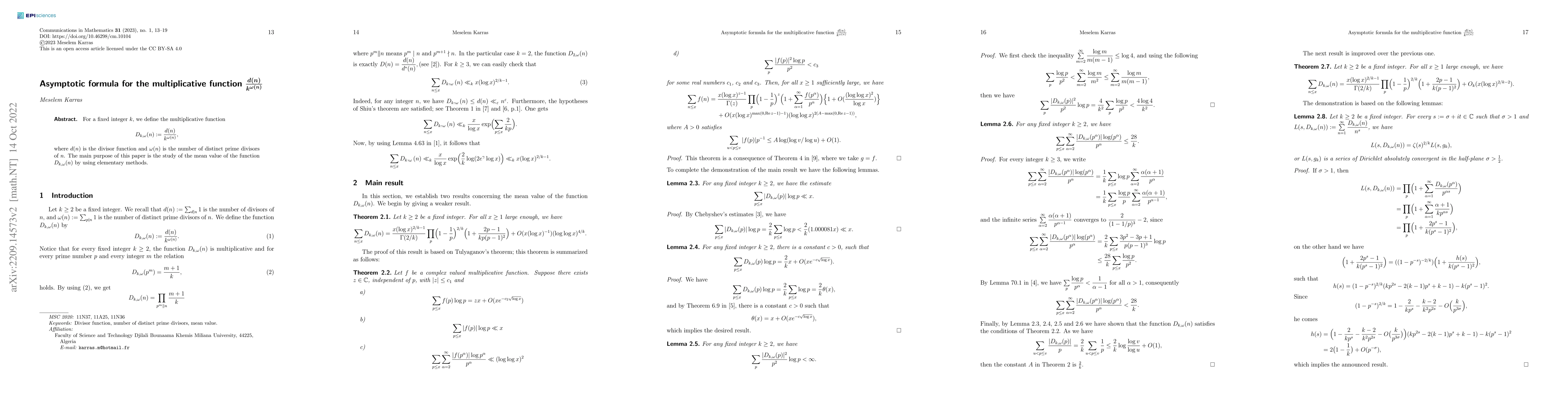 The paper presents new asymptotic formulas for the mean value of the multiplicative function Dk,ω(n) using elementary methods, extending previous work on related functions and providing a deeper understanding of their behavior.