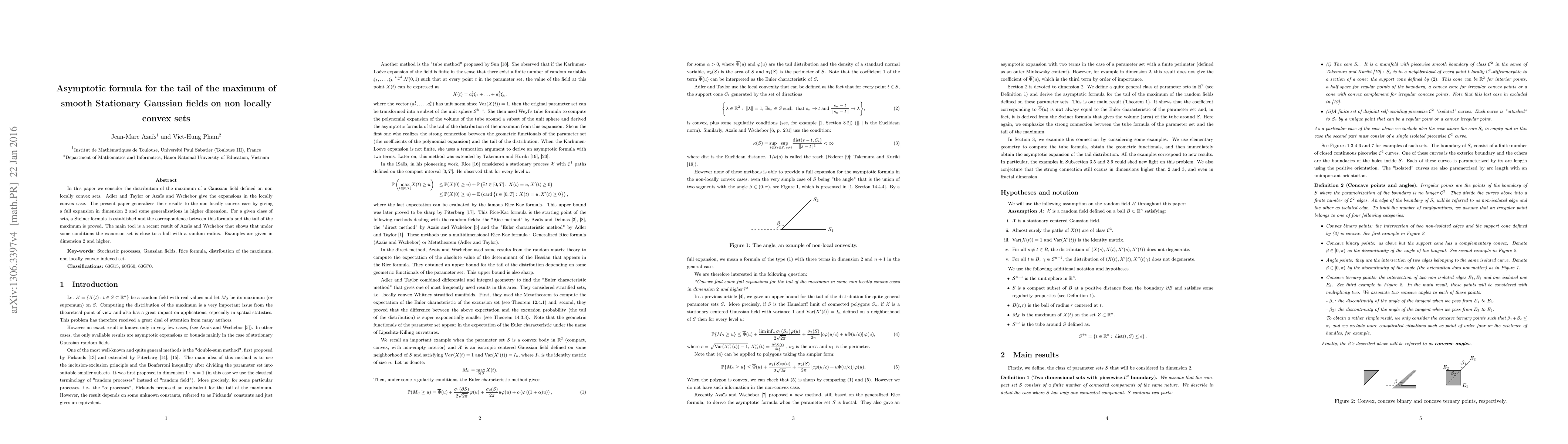 This paper generalizes asymptotic formulas for the maximum of smooth stationary Gaussian fields from locally convex to non locally convex sets, providing expansions in dimension 2 and higher. It establishes a Steiner formula and proves its correspondence to the tail of the maximum, utilizing a recent result on the similarity of excursion sets to random radius balls.