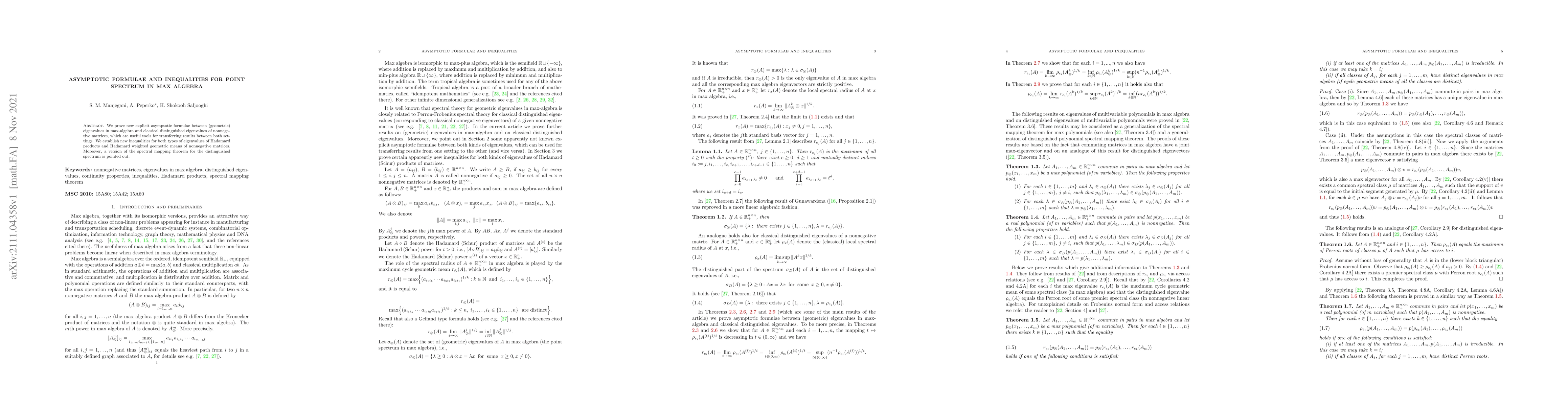 This paper presents new asymptotic formulae linking geometric eigenvalues in max-algebra to classical distinguished eigenvalues in nonnegative matrices, facilitating result transfer between the two settings. It also introduces inequalities for eigenvalues of Hadamard products and weighted geometric means, along with a spectral mapping theorem for the distinguished spectrum.