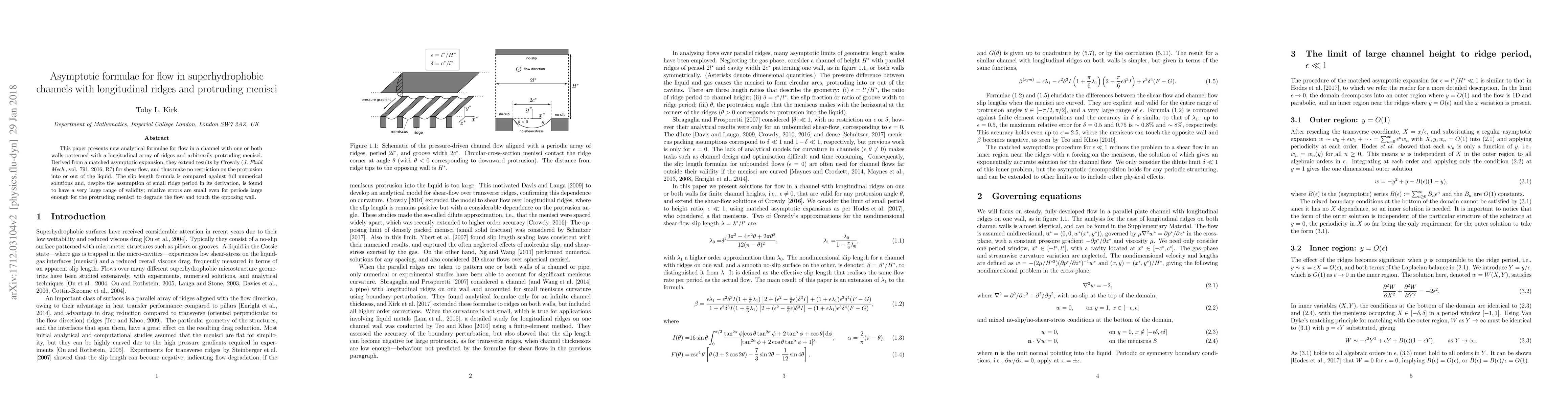 This paper presents new analytical formulae for flow in a channel with one or both walls patterned with a longitudinal array of ridges and arbitrarily protruding menisci. Derived from a matched asymptotic expansion, they extend results by Crowdy (J. Fluid Mech., vol. 791, 2016, R7) for shear flow, and thus make no restriction on the protrusion into or out of the liquid. The slip length formula is compared against full numerical solutions and, despite the assumption of small ridge period in its derivation, is found to have a very large range of validity; relative errors are small even for periods large enough for the protruding menisci to degrade the flow and touch the opposing wall.