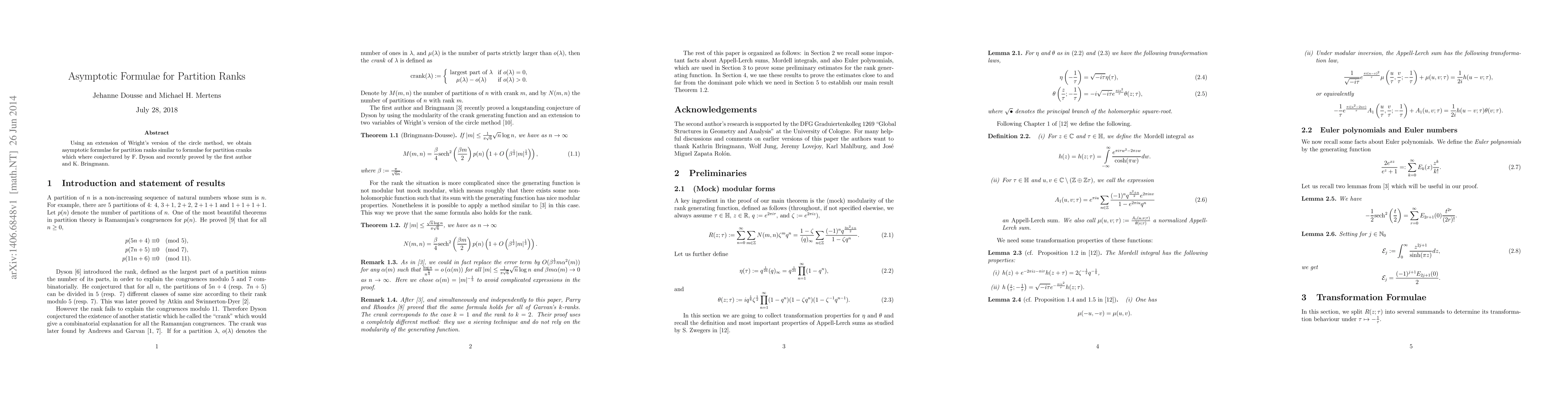 The paper presents asymptotic formulae for partition ranks using an extension of Wright's circle method, building on recent proofs of partition crank conjectures by Dyson, the first author, and Bringmann. These results extend understanding of partition structures in number theory.