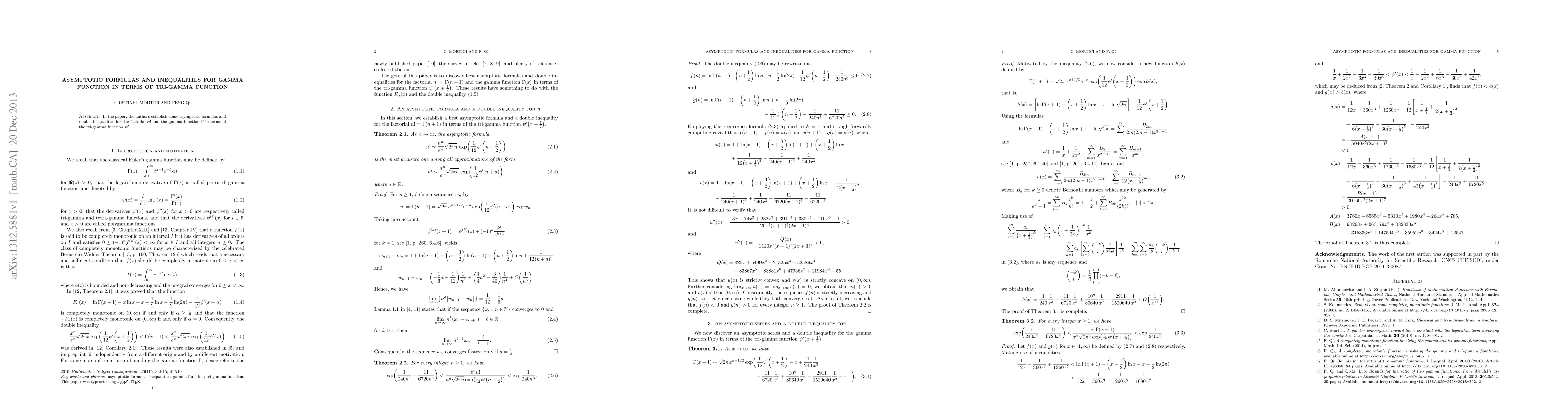 Summary: The paper presents asymptotic formulas and double inequalities relating the gamma function $\Gamma$ and the factorial $n!$ to the tri-gamma function $\psi'$. These results provide insights into the behavior of these functions as they approach infinity.