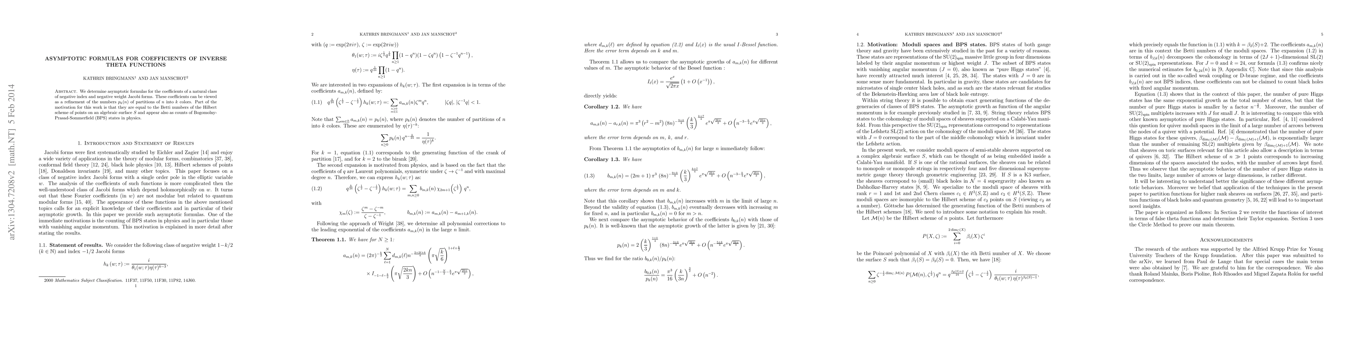 This paper derives asymptotic formulas for the coefficients of inverse theta functions, which refine partition numbers and are linked to Betti numbers of algebraic surfaces and counts of BPS states in physics. The study focuses on negative index and weight Jacobi forms.