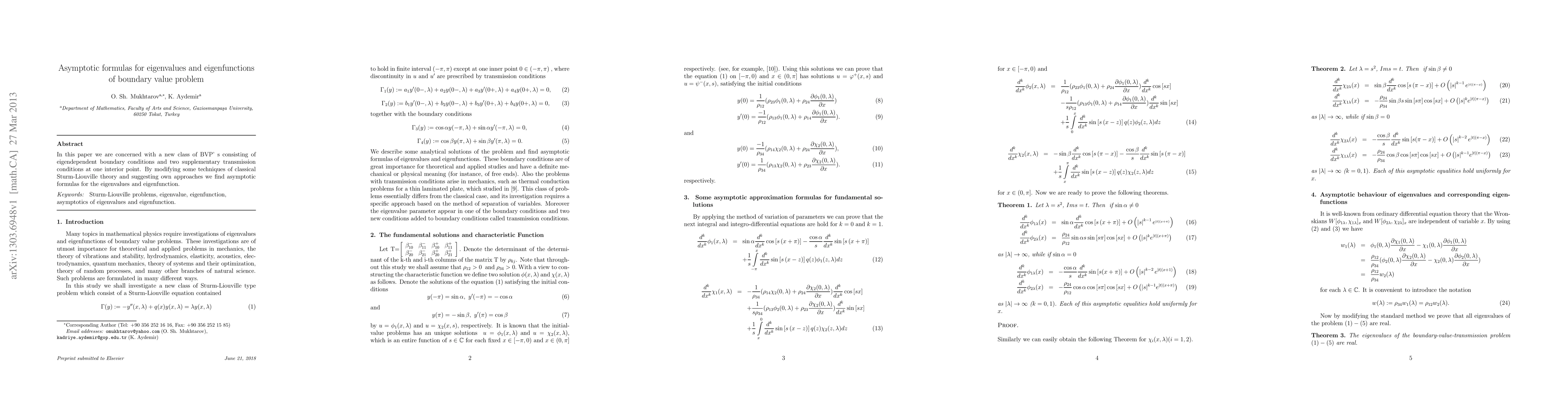 In this paper we are concerned with a new class of BVP' s consisting of eigendependent boundary conditions and two supplementary transmission conditions at one interior point. By modifying some techniques of classical Sturm-Liouville theory and suggesting own approaches we find asymptotic formulas for the eigenvalues and eigenfunction.