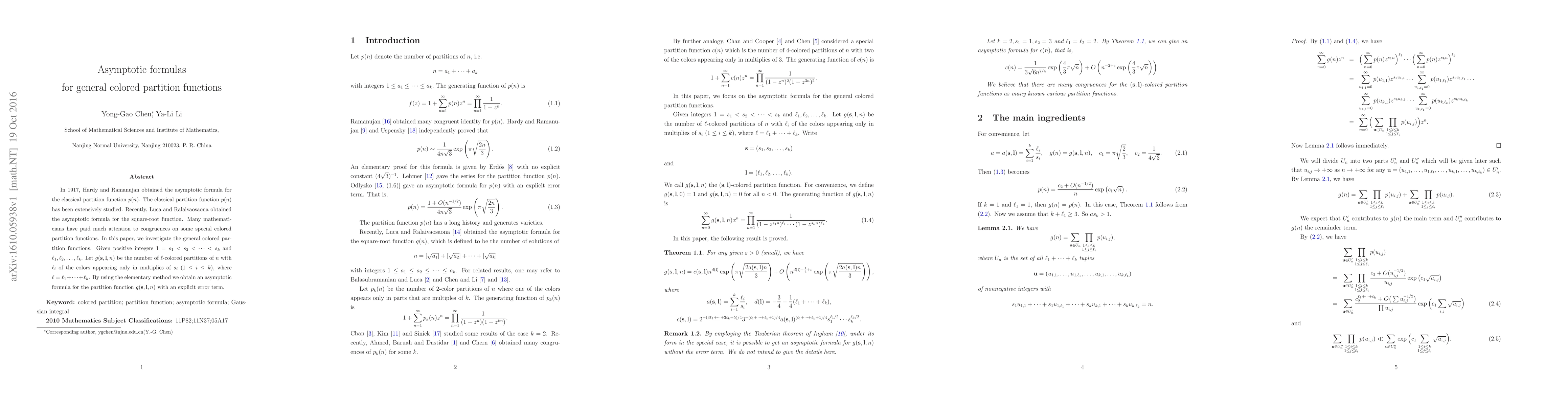 This paper derives an asymptotic formula for general colored partition functions, which is a mathematical concept used to count the number of ways to partition numbers into different colors with certain restrictions. The researchers use elementary methods to obtain this formula, providing new insights into the behavior of these complex mathematical objects.