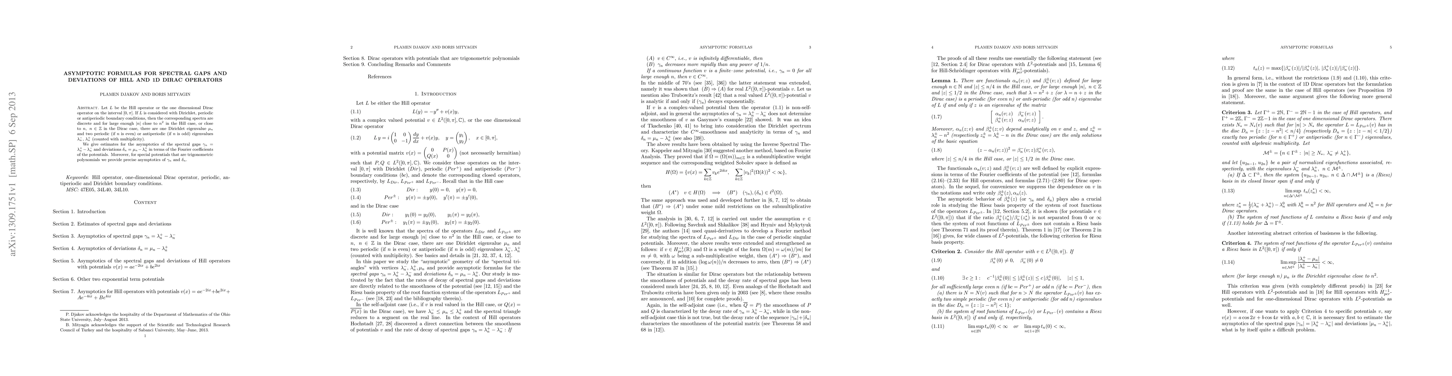 The paper provides asymptotic formulas for spectral gaps and deviations of Hill and 1D Dirac operators with different boundary conditions, relating them to Fourier coefficients of the potentials.