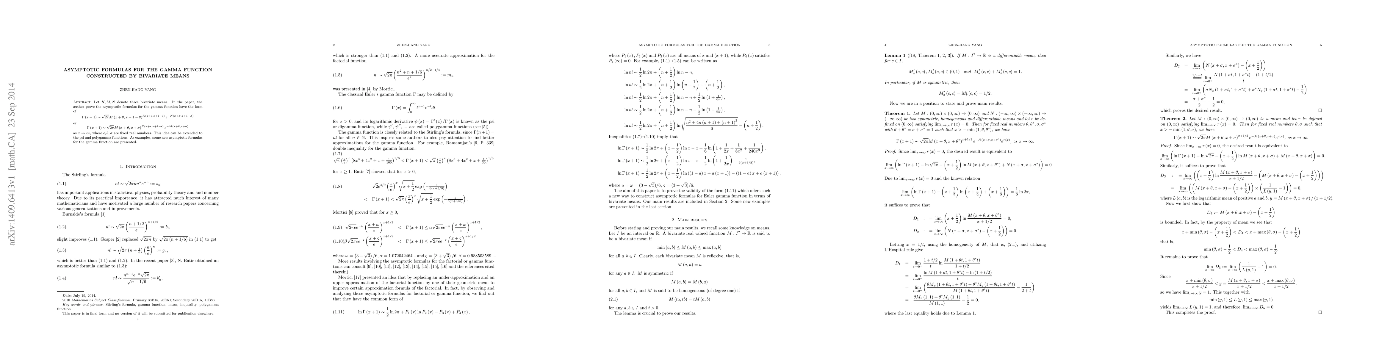 The paper presents asymptotic formulas for the gamma function using bivariate means, showing that $\Gamma(x+1)$ can be approximated by expressions involving $M$, $K$, and $N$ as $x$ approaches infinity. The results extend to the psi and polygamma functions.