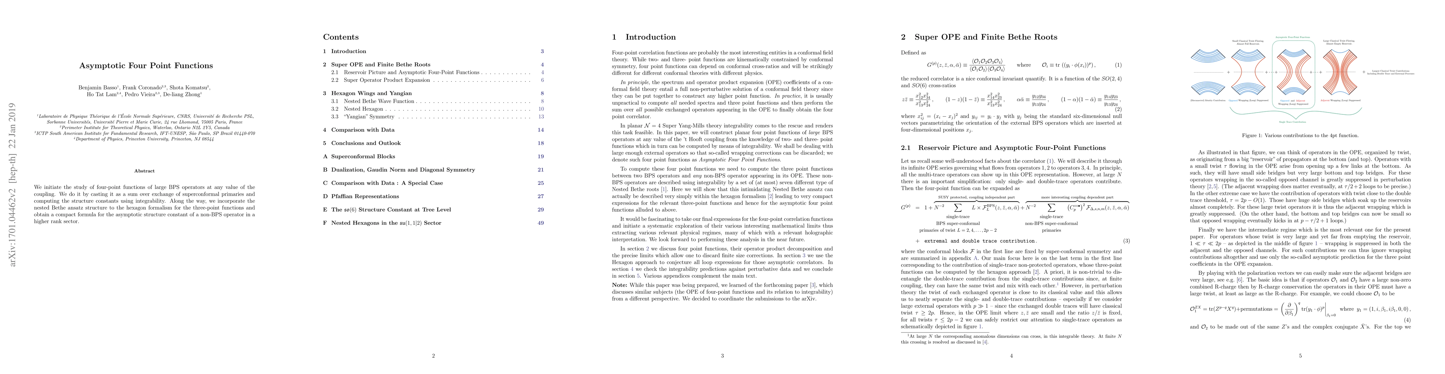 We initiate the study of four-point functions of large BPS operators at any value of the coupling. We do it by casting it as a sum over exchange of superconformal primaries and computing the structure constants using integrability. Along the way, we incorporate the nested Bethe ansatz structure to the hexagon formalism for the three-point functions and obtain a compact formula for the asymptotic structure constant of a non-BPS operator in a higher rank sector.
