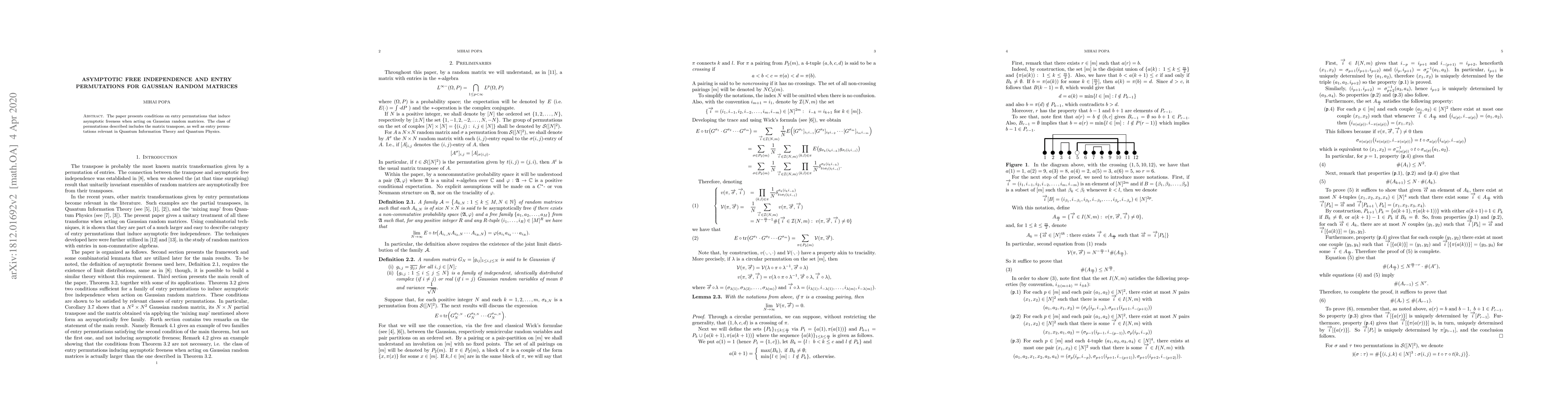 The paper defines conditions under which specific entry permutations of Gaussian random matrices lead to asymptotic freeness, including the matrix transpose and permutations significant in Quantum Information Theory and Quantum Physics. These findings contribute to understanding the structure of large random matrices in both classical and quantum contexts.