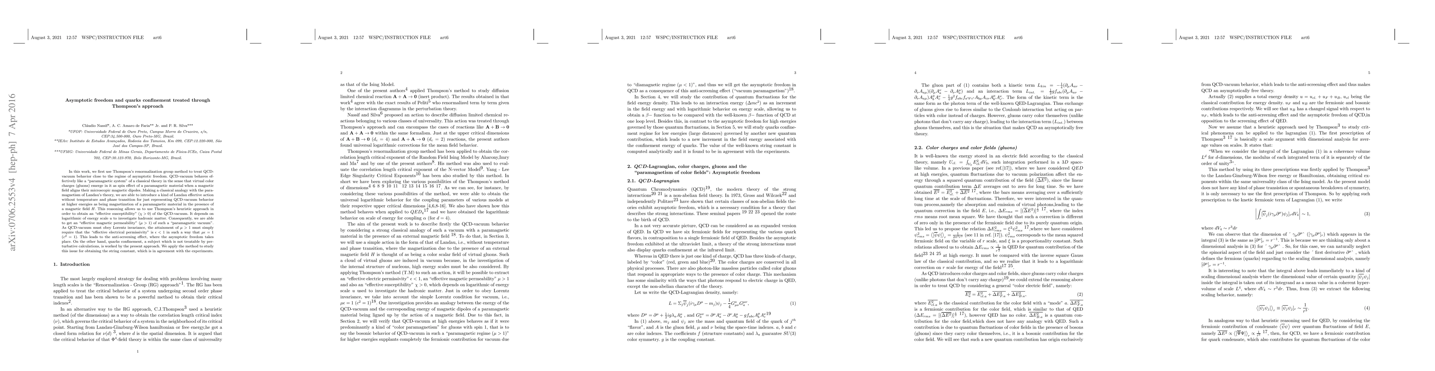 In this work, we first use Thompson's renormalization group method to treat QCD-vacuum behavior close to the regime of asymptotic freedom. QCD-vacuum behaves effectively like a "paramagnetic system" of a classical theory in the sense that virtual color charges (gluons) emerge in it as spin effect of a paramagnetic material when a magnetic field aligns their microscopic magnetic dipoles. Making a classical analogy with the paramagnetism of Landau's theory,we are able to introduce a kind of Landau effective action without temperature and phase transition for simply representing QCD-vacuum behavior at higher energies as magnetization of a paramagnetic material in the presence of a magnetic field H. This reasoning allows us to use Thompson's heuristic approach in order to extract an "effective susceptibility" ($\chi>0$) of QCD-vacuum. It depends on logarithmic of energy scale u to investigate hadronic matter. Consequently,we are able to get an "effective magnetic permeability" ($\mu>1$) of such a "paramagnetic vacuum". As QCD-vacuum must obey Lorentz invariance,the attainment of $\mu>1$ must simply require that the "effective electrical permissivity" is $\epsilon<1$,in such a way that $\mu\epsilon=1$ (c^2=1).This leads to the antiscreening effect, where the asymptotic freedom takes place. On the other hand, quarks cofinement, a subject which is not treatable by perturbative calculations, is worked by the present approach. We apply the method to study this subject in order to obtain the string constant, which is in agreement with the experiments.