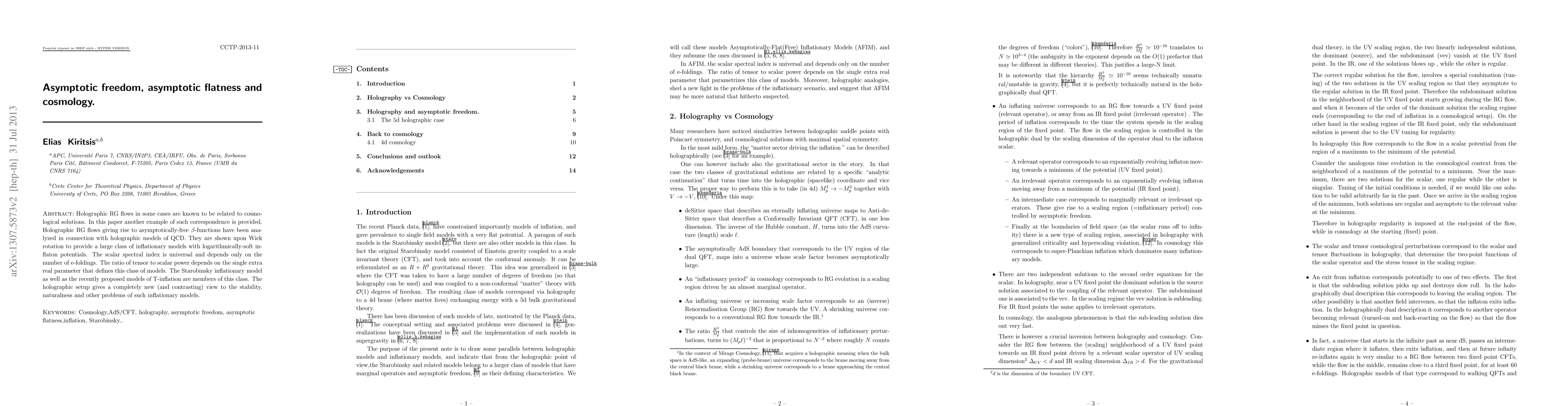 Holographic RG flows in some cases are known to be related to cosmological solutions. In this paper another example of such correspondence is provided. Holographic RG flows giving rise to asymptotically-free $\beta$-functions have been analyzed in connection with holographic models of QCD. They are shown upon Wick rotation to provide a large class of inflationary models with logarithmically-soft inflaton potentials. The scalar spectral index is universal and depends only on the number of e-foldings. The ratio of tensor to scalar power depends on the single extra real parameter that defines this class of models. The Starobinsky inflationary model as well as the recently proposed models of T-inflation are members of this class. The holographic setup gives a completely new (and contrasting) view to the stability, naturalness and other problems of such inflationary models.