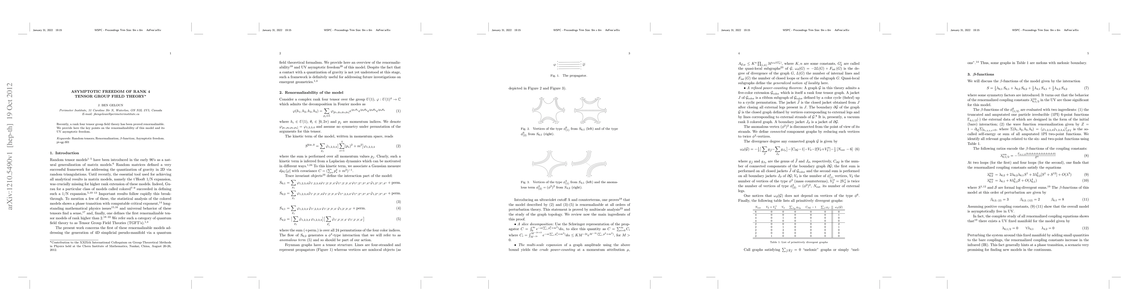 Recently, a rank four tensor group field theory has been proved renormalizable. We provide here the key points on the renormalizability of this model and its UV asymptotic freedom.
