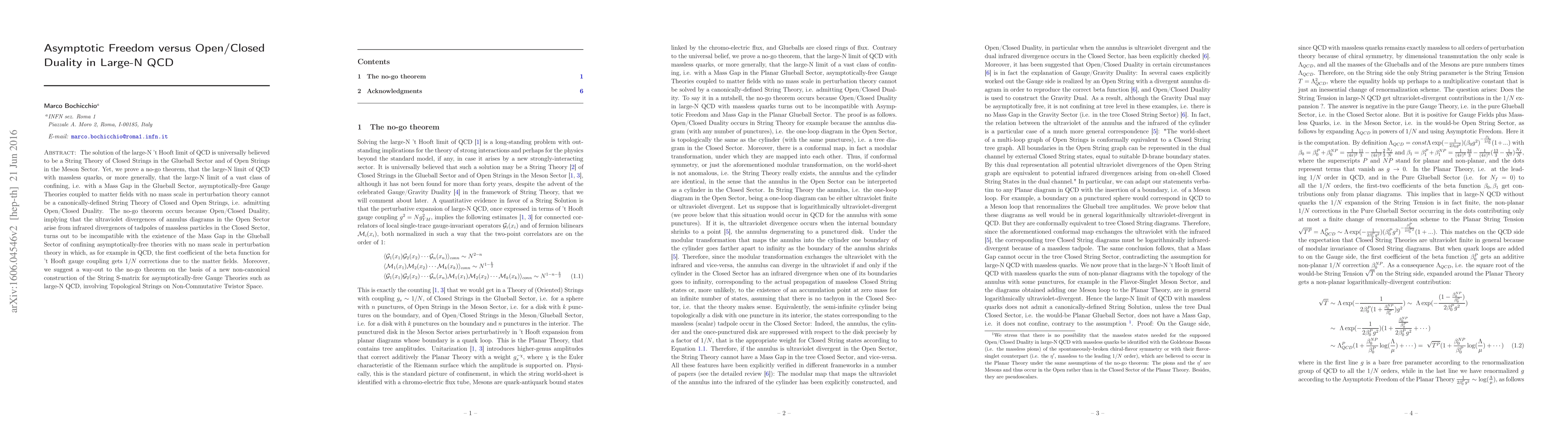 This paper proves a no-go theorem showing that the large-N limit of QCD and similar confining, asymptotically-free gauge theories cannot be described by a canonical String Theory with Open/Closed Duality due to the incompatibility with the Mass Gap in the Glueball Sector. A potential solution is proposed through a new non-canonical String S-matrix construction involving Topological Strings on Non-Commutative Twistor Space.