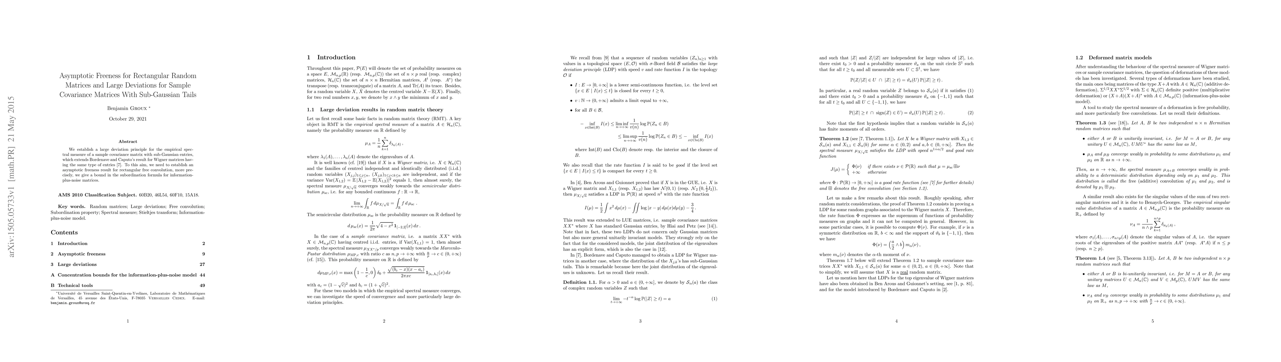 This paper establishes a large deviation principle for the empirical spectral measure of a sample covariance matrix with sub-Gaussian entries, extending previous results for Wigner matrices. It also introduces an asymptotic freeness result for rectangular free convolution, providing a bound in the subordination formula for information-plus-noise matrices.