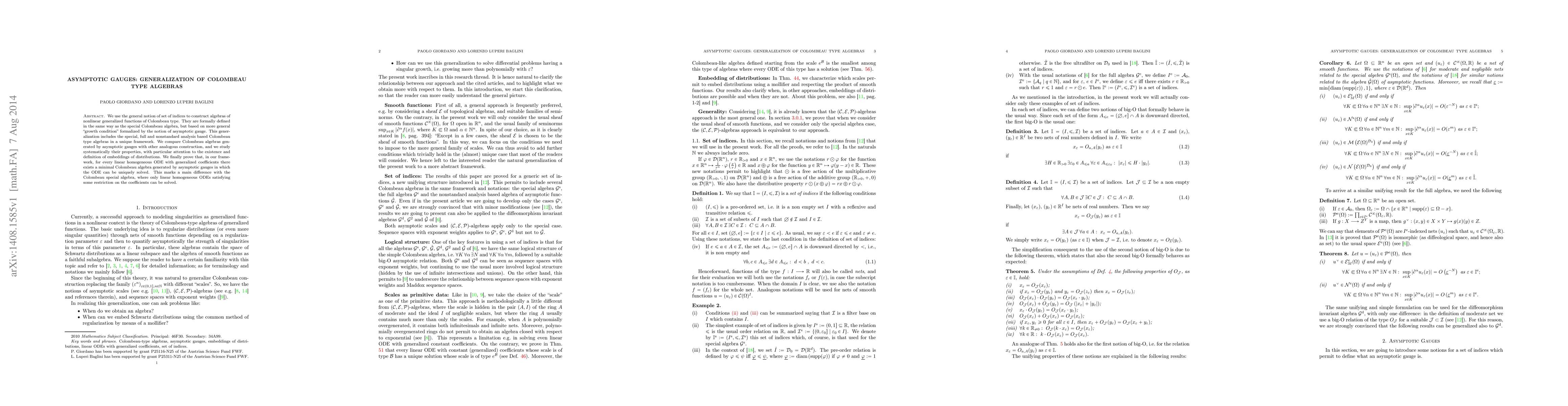 We use the general notion of set of indices to construct algebras of nonlinear generalized functions of Colombeau type. They are formally defined in the same way as the special Colombeau algebra, but based on more general growth condition formalized by the notion of asymptotic gauge. This generalization includes the special, full and nonstandard analysis based Colombeau type algebras in a unique framework. We compare Colombeau algebras generated by asymptotic gauges with other analogous construction, and we study systematically their properties, with particular attention to the existence and definition of embeddings of distributions. We finally prove that, in our framework, for every linear homogeneous ODE with generalized coefficients there exists a minimal Colombeau algebra generated by asymptotic gauges in which the ODE can be uniquely solved. This marks a main difference with the Colombeau special algebra, where only linear homogeneous ODEs satisfying some restriction on the coefficients can be solved.