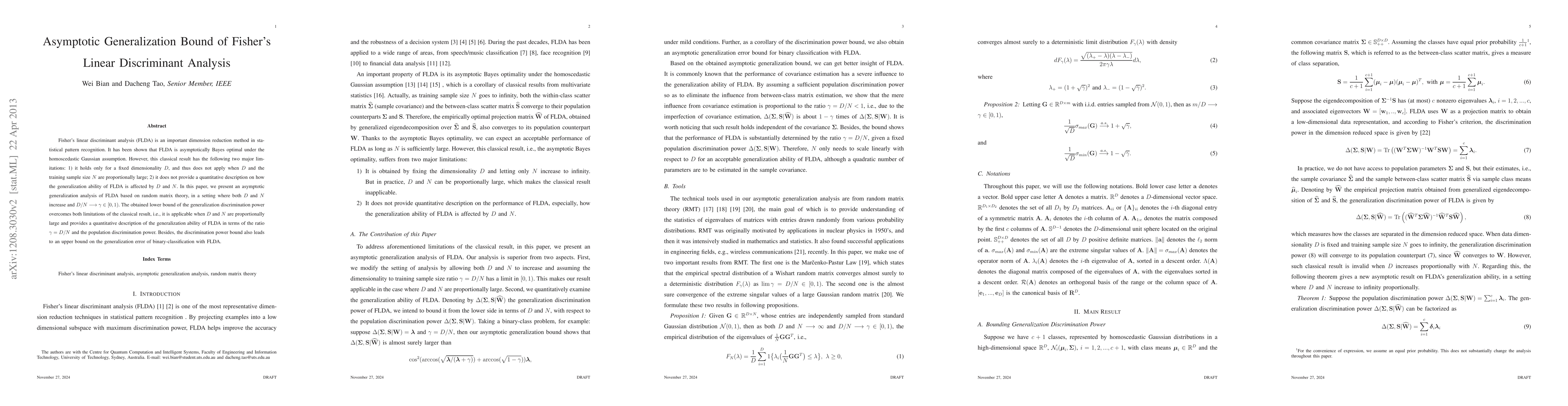 This paper presents an asymptotic generalization bound for Fisher's linear discriminant analysis (FLDA) using random matrix theory, addressing its limitations when dimensionality and sample size are large. The derived lower bound provides a quantitative description of FLDA's generalization ability in terms of the ratio of dimensionality to sample size and population discrimination power.