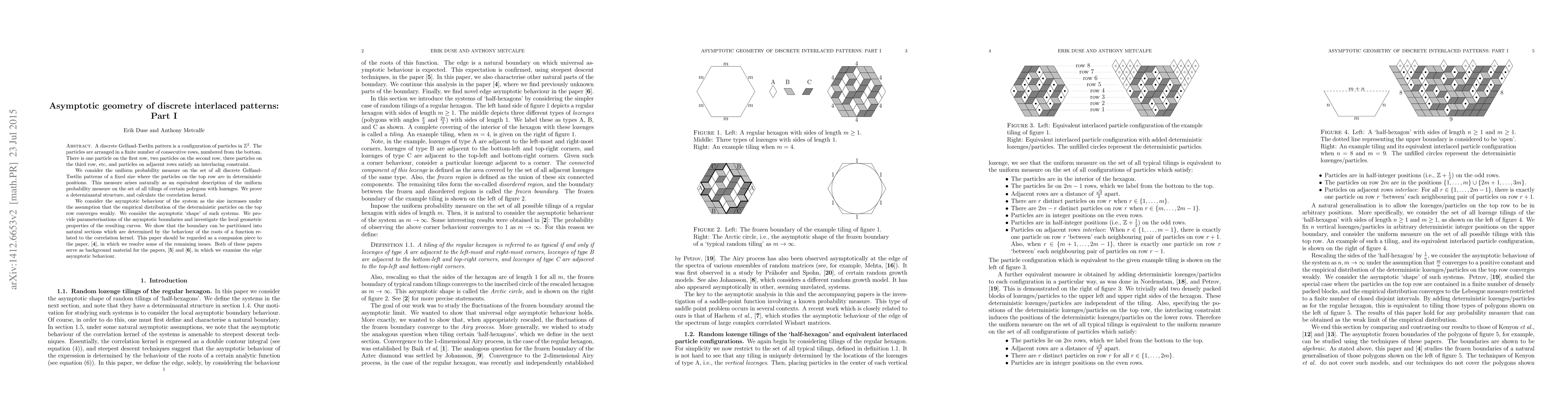 A discrete Gelfand-Tsetlin pattern is a configuration of particles in Z^2. The particles are arranged in a finite number of consecutive rows, numbered from the bottom. There is one particle on the first row, two particles on the second row, three particles on the third row, etc, and particles on adjacent rows satisfy an interlacing constraint. We consider the uniform probability measure on the set of all discrete Gelfand-Tsetlin patterns of a fixed size where the particles on the top row are in deterministic positions. This measure arises naturally as an equivalent description of the uniform probability measure on the set of all tilings of certain polygons with lozenges. We prove a determinantal structure, and calculate the correlation kernel. We consider the asymptotic behaviour of the system as the size increases under the assumption that the empirical distribution of the deterministic particles on the top row converges weakly. We consider the asymptotic `shape' of such systems. We provide parameterisations of the asymptotic boundaries and investigate the local geometric properties of the resulting curves. We show that the boundary can be partitioned into natural sections which are determined by the behaviour of the roots of a function related to the correlation kernel. This paper should be regarded as a companion piece to the upcoming paper, [4], in which we resolve some of the remaining issues. Both of these papers serve as background material for the upcoming papers, [5] and [6], in which we examine the edge asymptotic behaviour.