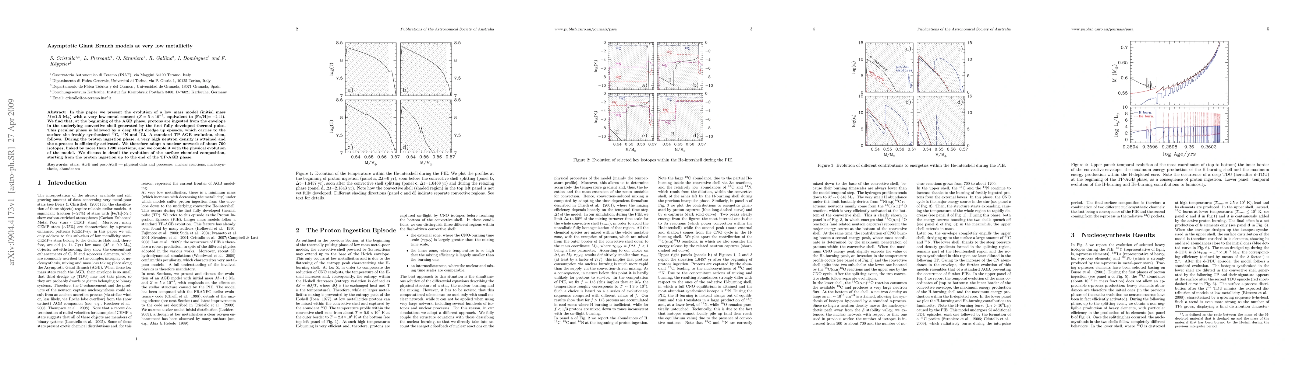 In this paper we present the evolution of a low mass model (initial mass M=1.5 Msun) with a very low metal content (Z=5x10^{-5}, equivalent to [Fe/H]=-2.44). We find that, at the beginning of the AGB phase, protons are ingested from the envelope in the underlying convective shell generated by the first fully developed thermal pulse. This peculiar phase is followed by a deep third dredge up episode, which carries to the surface the freshly synthesized 13C, 14N and 7Li. A standard TP-AGB evolution, then, follows. During the proton ingestion phase, a very high neutron density is attained and the s-process is efficiently activated. We therefore adopt a nuclear network of about 700 isotopes, linked by more than 1200 reactions, and we couple it with the physical evolution of the model. We discuss in detail the evolution of the surface chemical composition, starting from the proton ingestion up to the end of the TP-AGB phase.