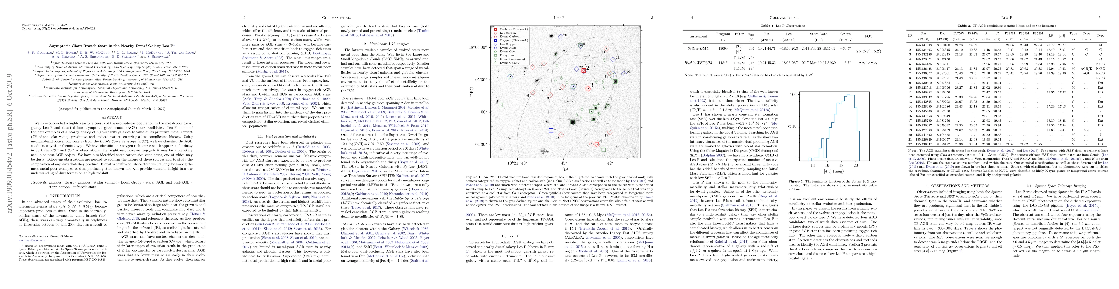This study identifies four asymptotic giant branch (AGB) star candidates in the metal-poor dwarf galaxy Leo P, using HST and Spitzer observations. The findings suggest one oxygen-rich and three carbon-rich AGB stars, potentially among the most metal-poor dust-producing stars, offering insights into dust formation in high-redshift galaxies.