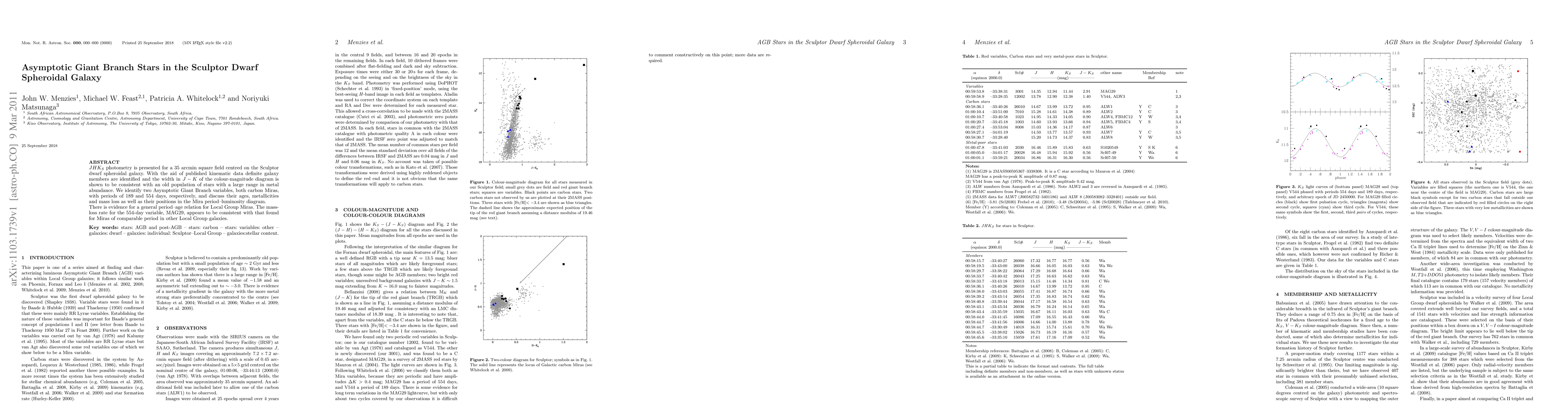 This study presents JHK_S photometry for the Sculptor dwarf galaxy, identifying old population stars with a wide range in metal abundance. Two Asymptotic Giant Branch carbon Mira variables are found, analyzed for age, metallicity, and mass loss, showing evidence for a general period-age relation among Local Group Miras.