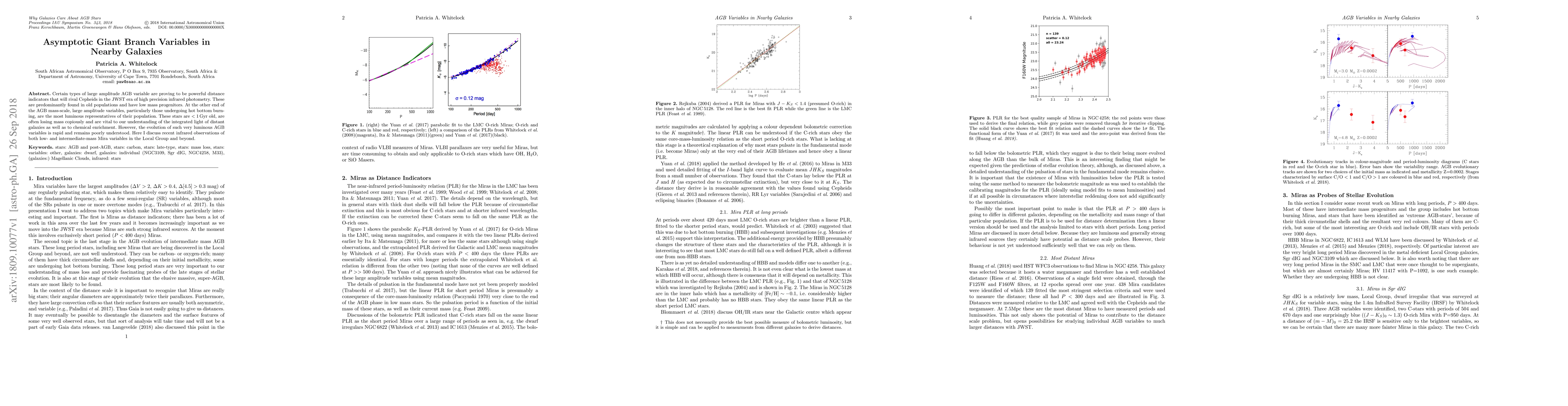Large amplitude AGB variables, found in old populations and low mass progenitors, are emerging as crucial distance indicators. Recent infrared observations reveal insights into the evolution of both low- and intermediate-mass Mira variables in nearby galaxies, though the rapid evolution of very luminous AGB variables remains unclear.