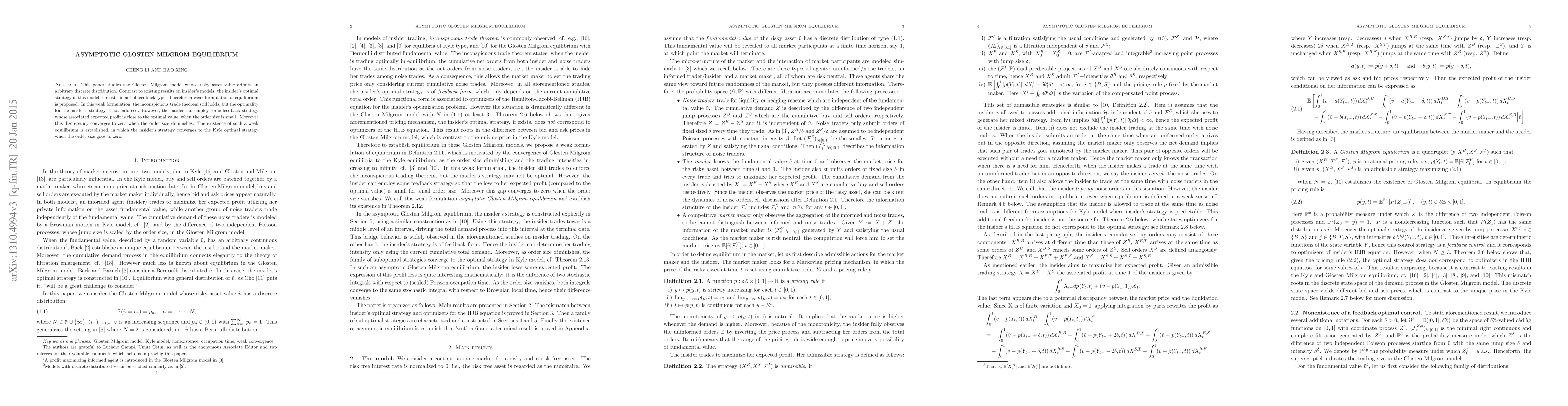 This paper studies the Glosten Milgrom model whose risky asset value admits an arbitrary discrete distribution. Contrast to existing results on insider's models, the insider's optimal strategy in this model, if exists, is not of feedback type. Therefore a weak formulation of equilibrium is proposed. In this weak formulation, the inconspicuous trade theorem still holds, but the optimality for the insider's strategy is not enforced. However, the insider can employ some feedback strategy whose associated expected profit is close to the optimal value, when the order size is small. Moreover this discrepancy converges to zero when the order size diminishes. The existence of such a weak equilibrium is established, in which the insider's strategy converges to the Kyle optimal strategy when the order size goes to zero.