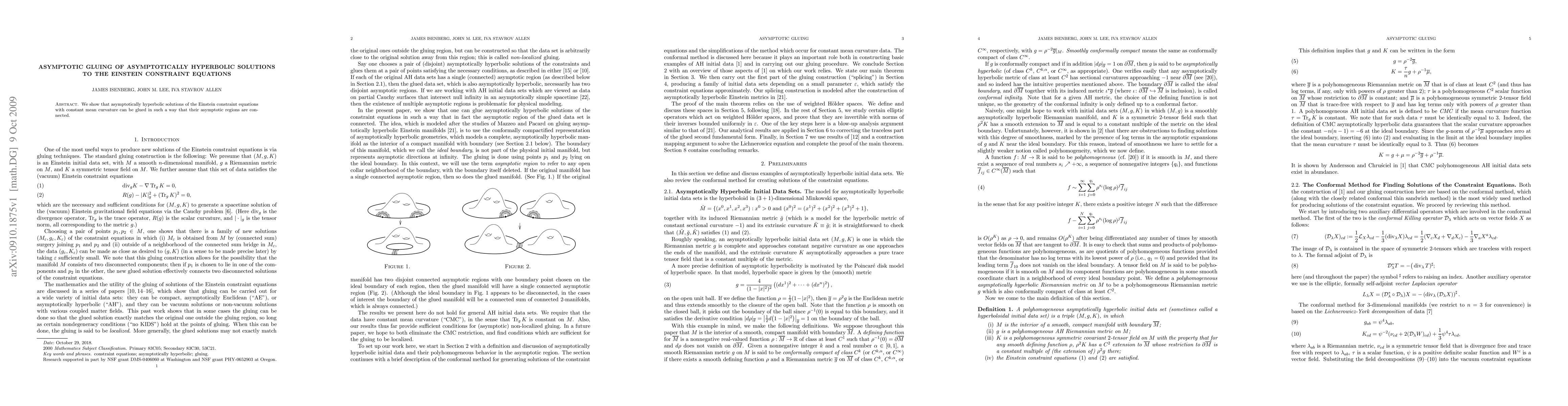 Summary: This paper demonstrates the asymptotic gluing technique for asymptotically hyperbolic solutions to the Einstein constraint equations, showing that regions with constant mean curvature can be connected seamlessly.