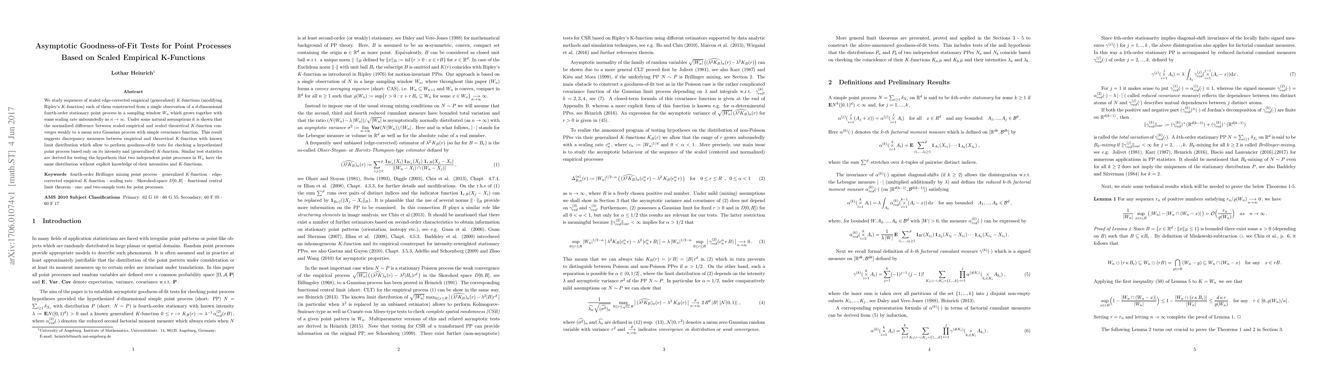 This paper develops asymptotic goodness-of-fit tests for point processes based on scaled empirical K-functions, showing that the normalized difference between empirical and theoretical K-functions converges to a Gaussian process, enabling hypothesis tests for both single and two-point processes.