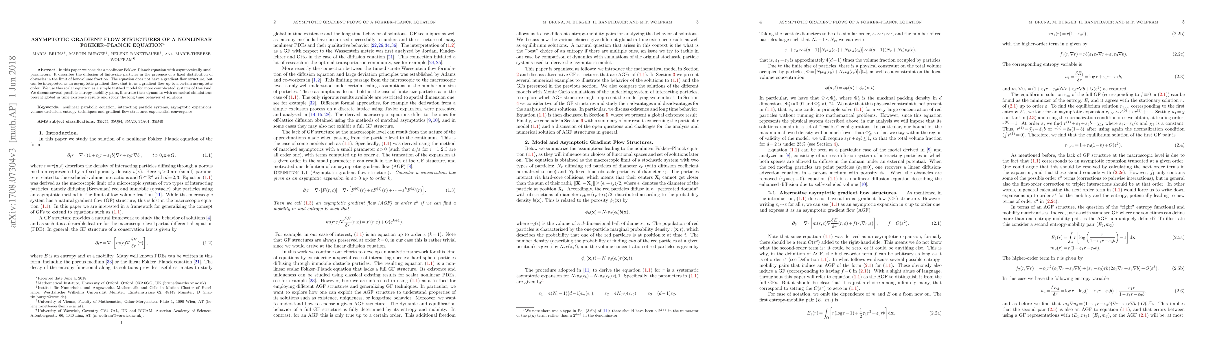 This paper examines a nonlinear Fokker-Planck equation with small parameters, describing particle diffusion amidst obstacles at low volume fractions. It reveals an asymptotic gradient flow structure despite the equation lacking a traditional gradient flow, and explores its dynamics, existence, and long-term behavior through numerical simulations.