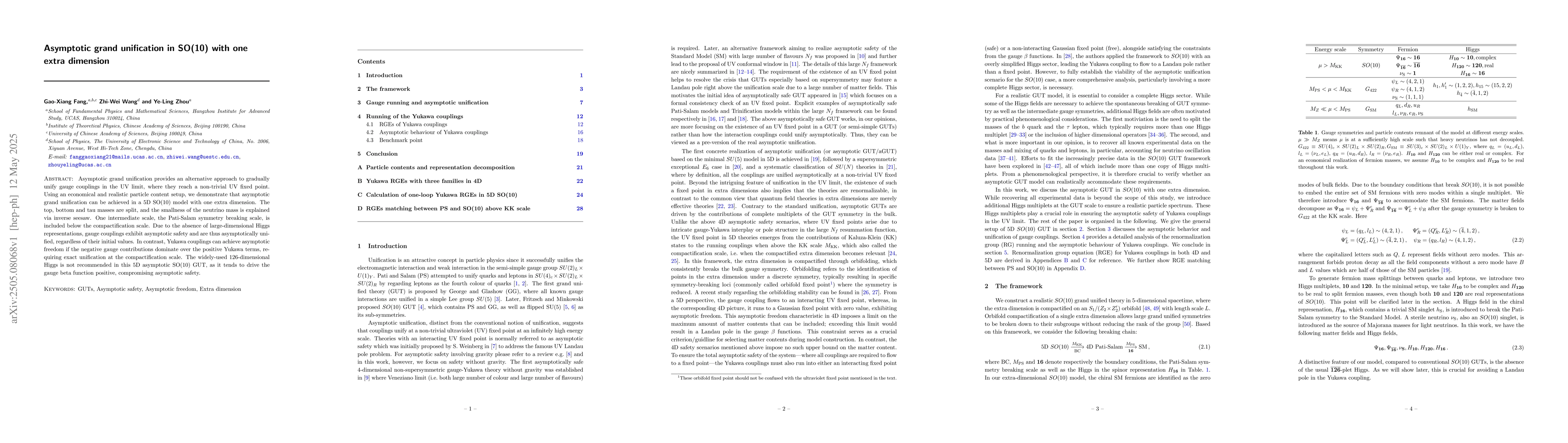 The paper proposes a 5D SO(10) model with one extra dimension that achieves asymptotic grand unification, highlighting the role of asymptotic safety in gauge couplings and asymptotic freedom in Yukawa couplings.