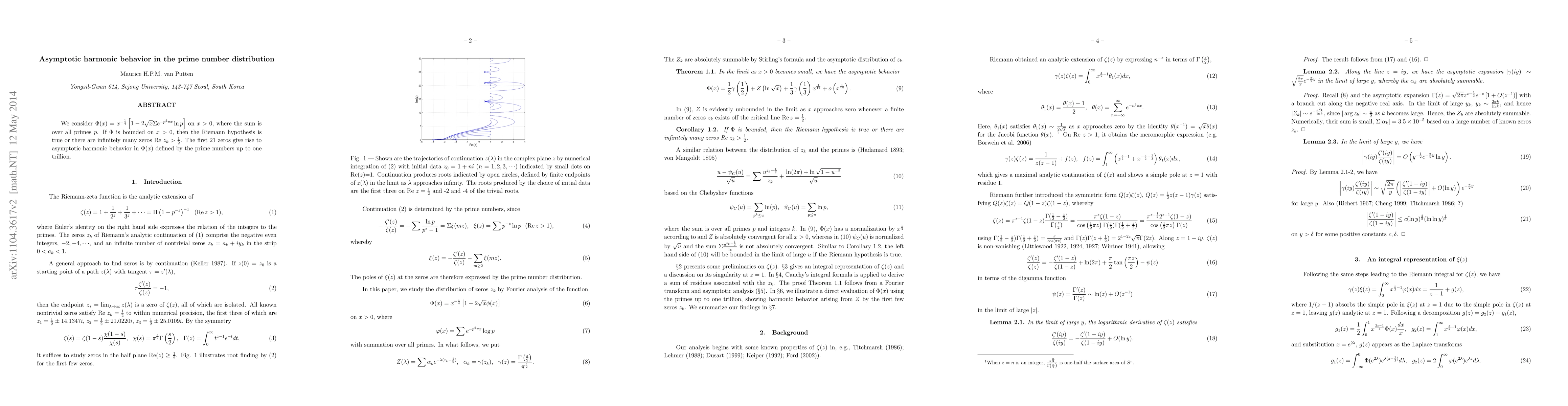 We consider $\Phi(x)=x^{-\frac{1}{4}}\left[1-2\sqrt{x}\Sigma e^{-p^2\pi x}\ln p\right]$ on $x>0$, where the sum is over all primes $p$. If $\Phi$ is bounded on $x>0$, then the Riemann hypothesis is true or there are infinitely many zeros Re~$z_k>\frac{1}{2}$. The first 21 zeros give rise to asymptotic harmonic behavior in $\Phi(x)$ defined by the prime numbers up to one trillion.
