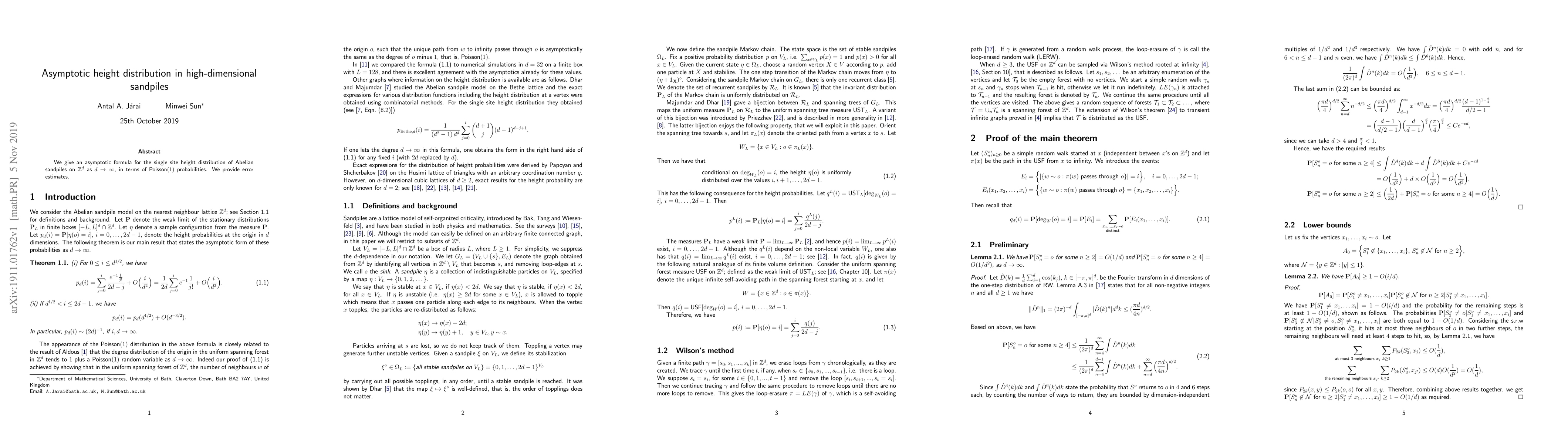 We give an asymptotic formula for the single site height distribution of Abelian sandpiles on $\mathbb{Z}^d$ as $d \to \infty$, in terms of $\mathsf{Poisson}(1)$ probabilities. We provide error estimates.