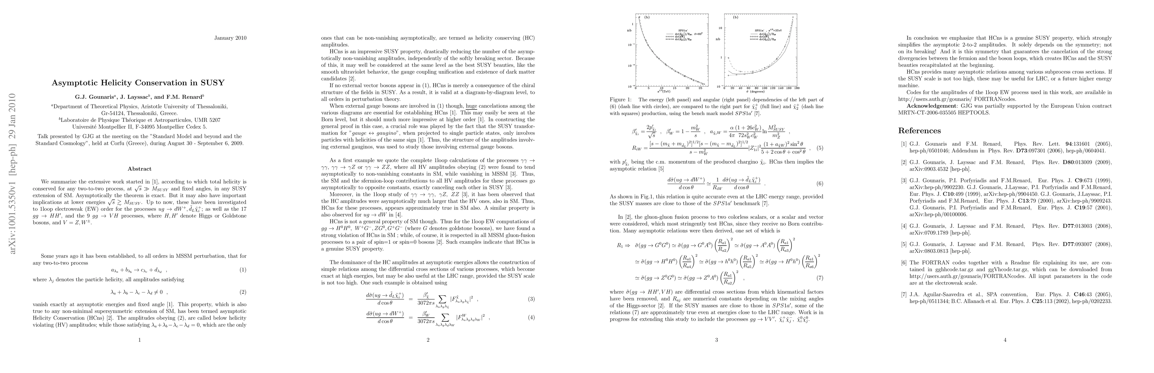 We summarize the extensive work started in ref.1, according to which total helicity is conserved for any two-to-two process, at sqrt{s} larger than M_{SUSY} and fixed angles, in any SUSY extension of SM. Asymptotically the theorem is exact. But it may also have important implications at lower energies sqrt{s} close to M_{SUSY}. Up to now, these have been investigated to 1loop electroweak (EW) order for the processes ug to d W+, sd_L chi+; as well as the 17 gg to HH', and the 9 gg to VH processes, where H,H' denote Higgs or Goldstone bosons, and V=Z, W.