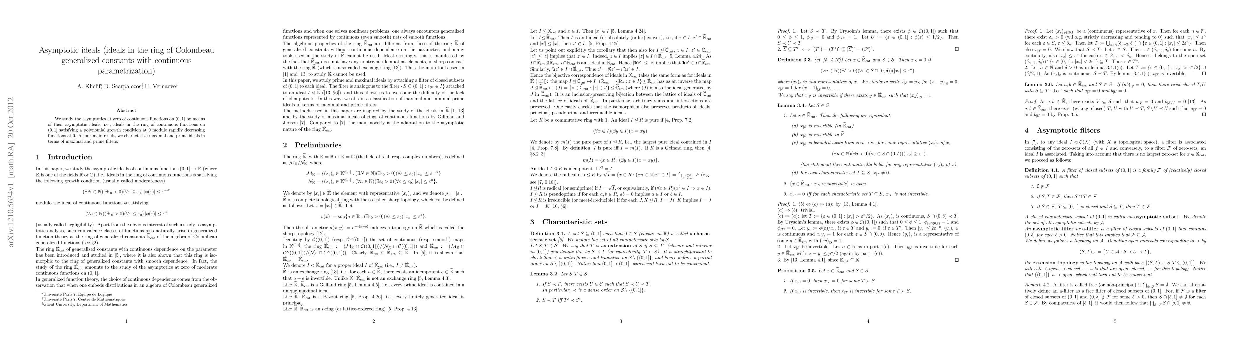We study the asymptotics at zero of continuous functions on (0, 1] by means of their asymptotic ideals, i.e., ideals in the ring of continuous functions on (0, 1] satisfying a polynomial growth condition at 0 modulo rapidly decreasing functions at 0. As our main result, we characterize maximal and prime ideals in terms of maximal and prime filters.